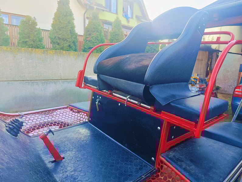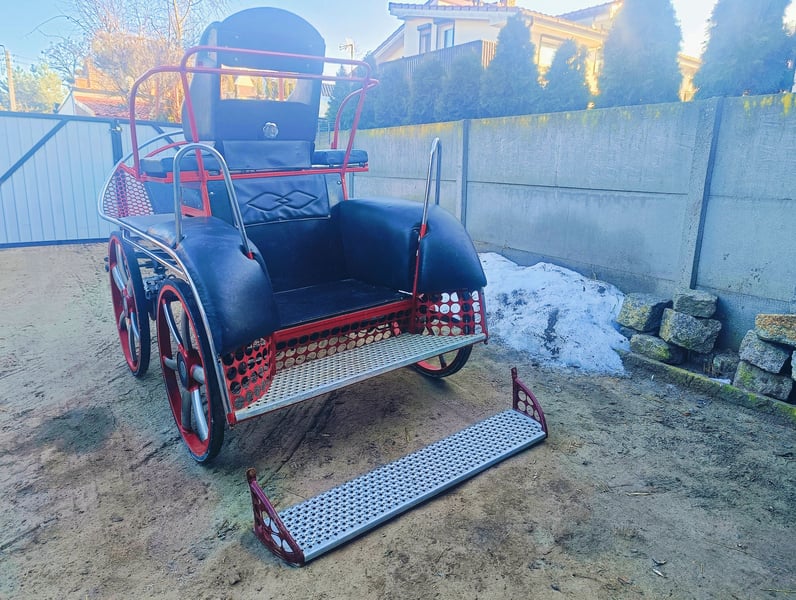 Marathon carriage for pair horses, suitable for horses with a height of approximately 15.5 to 16.9 hands. It also comes with single harnesses and an additional platform to extend the rear step. Wheelbase: 130 cm. Weight: 350 kg. Painted two years ago, except for the additional platform (which we forgot about). New rein cover included. The reins are extendable. Wheel bearings have been replaced. Brakes are in good working order. The front seat is adjustable and has new upholstery. Price: 10,000 PLN, negotiable. For more information, please call: 783-773-349.