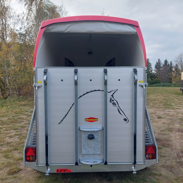 We are selling a new Böckmann ALU horse trailer Champion R for 2 horses / hood and bow in special color Fragaria... -Ab. Total weight: 2400 kg - Payload: 1497 kg - Empty weight: 903 kg - CFF-Plus chassis incl. wheel shock absorbers - Automatic jockey wheel - Lockable ball coupling - Tarpaulin lift with integrated net - Saddle box with extendable saddle holder and broom/shovel/net/mirror - Original Böckmann all-aluminium floor - Multi Safe System (safety box bar system) - Interior lighting blue / white - Rubber on loading flap (integrated step strips) and side stop - Side padding - Side kick protection - Chest bar padding - Lighting system with reversing light and plug 13-pin - Price incl. VAT more new and used horse trailers in stock! Vehicle registration for registration is possible for a surcharge of 5 € in advance! Delivery by arrangement, trade-in and financing possible Viewing/pick-up in 16845 Großderschau by arrangement at 033875-909588 possible at any time! Opening hours: Monday - Friday 8.00 a.m. - 5.00 p.m.