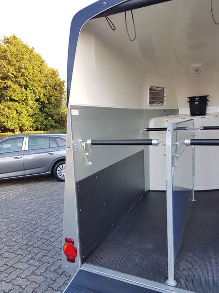 Humbaur Equitos Alu Plus Black 2000 Horse Trailer Car Trailer Age: New (Year of Manufacture: 2025) 2 years of main inspection from the date of first registration Including registration documents (vehicle registration document / registration certificate part 2 and COC) Available from: Immediately (in stock)! Financing through our partner banks possible! Technical Data Permissible total weight: 2,000kg Empty weight: approx. 773kg Payload: approx. 1,227kg Number of axles: 2 Loading area length: 3,157mm Loading area width: 1,654mm Loading area height: 2,300mm Brake type: Braked, overrun brake Chassis: Low loader (wheels beside the body), rubber suspension axles Electrical system: 12V, 13-pin connector Tire size: 175/70 R13 Special Equipment None Standard Equipment EquiDrive® chassis including wheel shock absorbers (100 km/h approval) Alu-BiComp floor 21mm (no wood - rot-proof) Rubber floor 8mm thick Side step protection Body made of double-walled, anodized aluminum profiles Lockable saddle chamber with saddle holder, bridle holder, mirror, and net Rear support with lighting Entrance door with 3-point locking Overrun flap with tread strip rubber Split and height-adjustable breast and rear bars with panic release EquiLock® lockable partition wall Tinted opening windows in poly hood Poly hood in Black Metallic Interior lighting Hay net ring Windbreak Automatic support wheel Frame galvanized V-drawbar AL-KO or Knott axles and brake system Accessories (additional charge) Aluminum rims Silver / Black Saddle rack for 2 saddles (outside) Swiveling saddle rack for 1 saddle (outside) Roof window Foal grille Rear door rotatable and swiveling Continuous box bar for foal transport Step protection rubber for saddle chamber Side padding left and right Head partition wall for middle partition Tarpaulin roll PVC instead of windbreak Wear mat front Wear mat rear Trailer lock Spare wheel 175/70 R13 including spare wheel holder Vehicle delivery nationwide Registration nationwide Transfer license plate (valid for 5 days) Note Weight specifications may vary depending on equipment; errors, intermediate sales, and changes reserved!