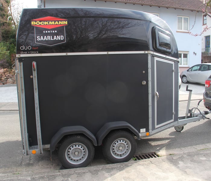 2-Pferde-Anhänger von Böckmann zu verkaufen, Modell "Duo Esprit silver + black". Erstzulassung 10.08.2023, war 6 Monate beim Händler als Mietanhänger im Einsatz, nach dem Kauf (17.06.2024) bei uns nur für den Umzug benutzt (keine Pferde, nur Umzugskartons), gebremst, Radstoßdämpfer, Aluboden, Trittschutz, 8-fach bereift (WR und SR), TÜV 06/2026, auf Wunsch neu. Absolut neuwertiger Zustand. VB: 6600,-€
