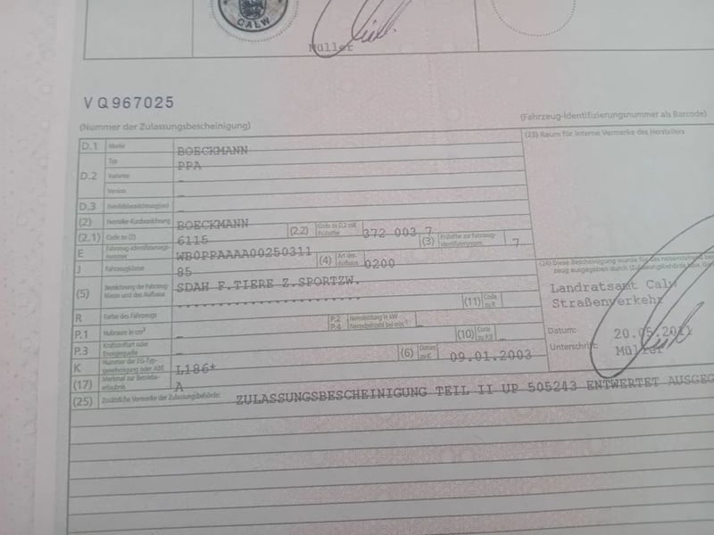 Je vends ma remorque Böckmann en bon état. Elle passe le contrôle technique chaque année sans problème. Prête à l'emploi immédiatement. Première mise en circulation en 2003 – voir la deuxième image du certificat d'immatriculation.