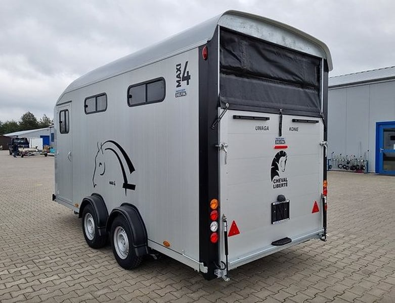 La Cheval Liberté Maxi 4 (Optimax) est une remorque conçue pour le transport de 4 chevaux en diagonale. Elle allie robustesse, confort et sécurité grâce à son châssis galvanisé, ses parois en aluminium, son plancher antidérapant et sa suspension Pullman II. Son espace intérieur modulable permet une adaptation à différentes tailles de chevaux. Elle est également équipée d’une sellerie complète et d’un casier de rangement.