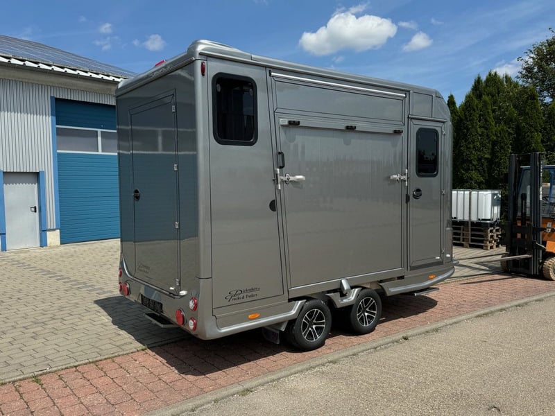 2 przyczepy do przewozu koni z pomieszczeniem na sprzęt 2,7 tony Wyposażenie: 2 przyczepy w wersji standardowej z pomieszczeniem dla koni Ocynkowane podwozie dopuszczalna masa całkowita 2700 kg; masa własna (1215 kg) Podłoga wykonana z aluminiowych profili zatrzaskowych z przyklejona specjalną gumową matą podłogową; W pełni izolowane panele boczne i dachowe o grubości 30 mm, Aerodynamiczna konstrukcja przodu Zamykane drzwi wejściowe po prawej stronie ze składanym stopniem wejściowym Rampa boczna z klapą wentylacyjną powyżej 2 opuszczane okna przy głowach koni 1 podłużne okno przesuwne naprzeciwko; 1 duży właz dachowy Regulowana ścianka działowa z mocowaniem na szyję Deska na rampie Ciągła zdejmowana listwa piersiowa Jedne duże drzwi zewnętrzne z tyłu Pomieszczenie na siodło z przodu ze składaną leżanką, 2 półkami na derki, uchwytem na uzdę i obrotowym uchwytem na siodło Papier COC Video+++++Video+++++ https://youtu.be/I9t9Be9Mprg Wyposażenie specjalne: za dodatkową opłatą Tapicerka boczna Radiowa kamera wideo Zewnętrzne podłączenie 220 V Aluminiowe paski bieżnika na rampie Zamontowane koło zapasowe Dostępny od ręki Oglądanie możliwe tylko po wcześniejszym umówieniu Zapytania na 01606106131--00491606106131