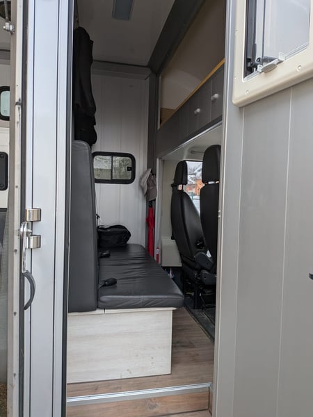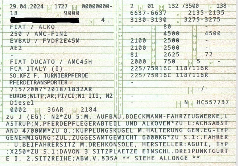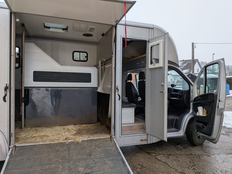 zzgl. Mehrwetsteuer (89.250,00€ brutto) EZ 04/24 11.277km TÜV bis 06/26 Wir geben unseren praktischen Pferdetransporter ab, weil wir uns vergrößert haben. Da er zur Zeit noch gelegentlich benutzt wird, ist er noch nicht gereinigt. Bei Nicht-Gebrauch stand der Transporter immer in der Halle. Die Besonderheit bei unserem Fahrzeug ist, dass er fünf eingetragene Sitzplätze hat und über dem Fahrerraum eine geräumige Schlafmöglichkeit. Der Pferderaum des Compact L Plus Stall Tour ist mit einer hohen, variablen Trennwand, einem 3-Türensystem und einem Durchgang zum Sattelraum ausgestattet. Die große Sattelkammer verfügt über zwei Sattelhalter und genügend Platz für sämtliches Equipment. Den Druchgang zur Sattelkammer haben wir verschlossen, aber die zwei Türen mit Bürstendichtung sind vorhanden und können bei Bedarf wieder eingesetzt werden. Die Hengsttrennwand ist ebenfalls vorhanden, wurde aber kaum von uns benutzt. Durch das 3-Türensystem ist eine flexible Nutzung des Pferderaumes möglich. Weiter Fahrzeugdaten können per Mail oder Telefon erfragt werden, ist nur sehr viel für die Anzeige.