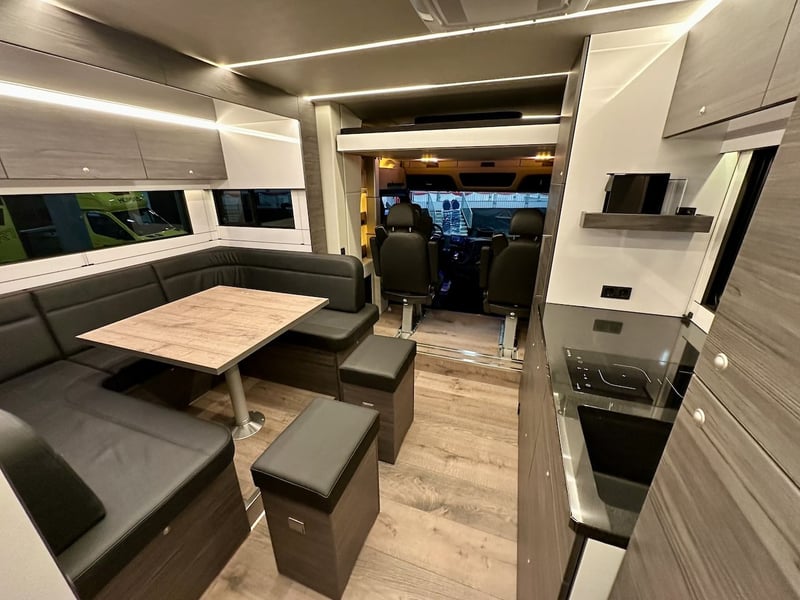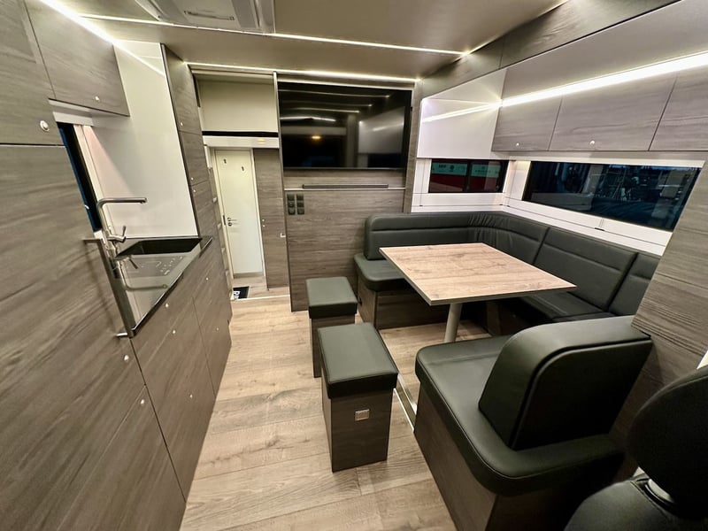 Neu und sofort verfügbar! Mercedes-Benz Actros 2545 RJH Exclusive H6 Pferdetransporter mit POP-OUT Actros 2545 Fahrgestell nach neuesten Standards und Vollausstattung, 450 PS, Automatik, Diesel, Euro6d, 26to. zulässiges Gesamtgewicht, AHK mit 3.500 kg Anhängelast, Abstandstempomat, Navigationssystem, komplette Luftfederung, Sitzheizung, Mirrorcams, etc. RJH EXCLUSIVE H6 Aufbau mit MEGA-SLIDE-OUT - zwei zusätzliche Drehsitze im Fahrerhaus und somit 4 Sitzplätze (insgesamt sind bis zu 6 eingetragene Sitzplätze möglich) - Großes separates Bad mit Dusche (Rain-Dance-Funktion möglich) und Keramiktoilette, Waschbecken und Badschrank - separater Schlafplatz über dem Bad - Entertainment-System mit Flat-Screen-TVs, automatischer SAT-Anlage (funktioniert auch mit 12 V, ebenso TV) - Komplette LED-Beleuchtung - Lederausstattung – Wände und Decke teilweise mit Skai-Leder bespannt - Insgesamt bis zu 6 Schlafmöglichkeiten und separates Pflegerabteil - Großer Führerhausdurchstieg – Dichtsystem mit 3-facher Sicherheit, absolut wasserdicht - Geräumiges Hochdach-Fahrerhaus mit elektrisch absenkbarem Kingsize-Bett - Aufbau und gesamte Technik sind absolut winterfest bis min. -20°C! (geeignet und erprobt für den professionellen Einsatz) Pferdeabteil - Pferdeabteil für bis zu 6 Pferde, Seilwinde, Heck- und Seitenrampe mit Rampenbegrenzer - Edelstahlspezialtrennwände mit neuem System komplett ohne Trog - Zwei mechanische Easy-Lift Rampen (seitlich und hinten) mit integrierter Verriegelung und Rampenbegrenzern aus Aluminium - Überwachungskamera im Pferderaum und Rückfahrkamera - Zwei große aufstellbare Dachhauben, Schiebefenster auf der Fahrer- und Beifahrerseite, sowie zwei Profi-Elektrolüfter für eine angenehme Luftzirkulation - mehrere isolierte Staufächer (somit wasserdicht und ohne Feuchtigkeitsbildung) und Außensattelkammer für Sättel und Trensen, sowie Deckenablagen - Aufbau ebenfalls voll isoliert und winterfest und dadurch für die Pferde auch an heißen Tagen deutlich kühler Weitere Informationen und Bilder erhalten Sie jederzeit gerne auf Anfrage! Besuchen Sie uns für eine Besichtigung und professionelle Beratung zu unseren Fahrzeuge nach Terminvereinbarung! RJH-Prospekt mit allen Fahrzeugen gedruckt oder digital nach Anfrage erhältlich. Die Roland Bauer Unternehmensgruppe bietet Ihnen ständig zwischen 15-20 Pferdetransportern in allen Kategorien und Größen. Irrtümer und Zwischen vorbehalten.