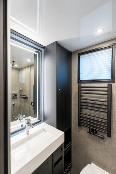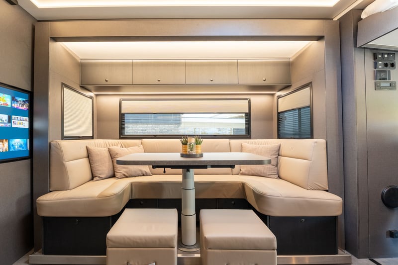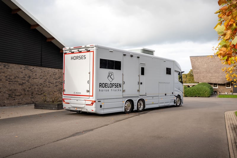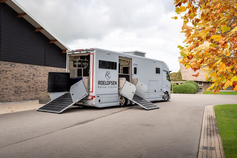 Roelofsen RR6 XL Profiliner Horse Truck Geeignet für bis zu 5 Pferde, extra großer Wohnbereich mit Pop-Out und Pop-Up, insgesamt 4/5 Schlafplätze Es gibt kein Standardchassis für die RR6 Profiliner. Häufig verwendete Chassis-Marken sind Volvo, Scania oder Mercedes. Aufbau • Robuster und hochwertiger Aluminium-Aufbau • Drei Kameras im Pferdebereich und eine an der Rückseite. • Kisten unter dem Ladeboden für zusätzlichen Stauraum Wohnbereich • Extrabreites Pop-out mit Sitzgruppe in Lederausstattung und Tisch – kann auch als Schlafmöglichkeit genutzt werden • Voll ausgestattete Küche mit Kombi-Backofen, Kühlschrank mit Gefrierfach und Küchenarmatur mit Spüle • TV im Wohnbereich • Elektrisches Hubbett im Fahrerhaus für zwei Schlafplätze • Pop-up über dem Badezimmer mit zwei Schlafplätzen • Badezimmer mit Dusche, Toilette und Badmöbel • Zentralheizung und Fußbodenheizung im Wohnzimmer, Flur und Badezimmer • Frischwassertank mit ca. 690 Litern und Abwassertank mit ca. 225 Litern Pferdeabteil • Eingerichtet für bis zu 5 Pferde • nachhaltiger Soft-Gummiboden • mit Gummi verkleidete Wände • hochwertige Trennwände aus Edelstahl mit transparentem PVC-Matten an der Unterseite Die Trennwände sind einfach verstellbar, sowohl vorne als hinten im Abstand von 10 cm. • Kickpads an der Rückseite • Edelstahl-Deckenhalterung • Schiebefenster an der Vorder- und Rückseite der Pferde mit Gittern • Elektrische Ventilatoren zur Belüftung und mehrere Dachluken • LED-Beleuchtung im Pferdebereich • Sichere Heck- und Seitenrampe, mit Gummi belegt und integrierten horizontalen Latten. Bietet ausreichenden Grip bei jedem Wetter • Rampenbegrenzer für zusätzliche Sicherheit beim Ein- und Ausladen • Abschlussplanke mit transparentem PVC für die Hinter- und Seitenrampe • Ausziehbare Edelstahl-Treppe am Eingang zum Wohnbereich • Außentür für den Zugang zum Pferdebereich und/oder zur Sattelkammer Mehrere Extras wie bspw. Temperaturregelungen für das Pferdeabteil, elektrische Winde oder Dachluken, schwenkbare Kopfteile oder Hengsttüren, sowie ein mobiler Turnierschrank mit Hebesystem im seitlichen Staufach sind auf Anfrage jederzeit möglich. Ebenso im Wohnbereich können Sie aus verschiedenen Extras, wie einer Waschmaschine oder einem Geschirrspüler wählen. Weitere Informationen und Bilder, sowie Informationen zu Lieferzeiten oder verfügbaren Modellen und Preisen je nach Ausstattung gerne auf Anfrage. Wir beraten Sie als Roelofsen-Händler für Deutschland und Österreich jederzeit gerne. Irrtümer und Zwischenverkauf.