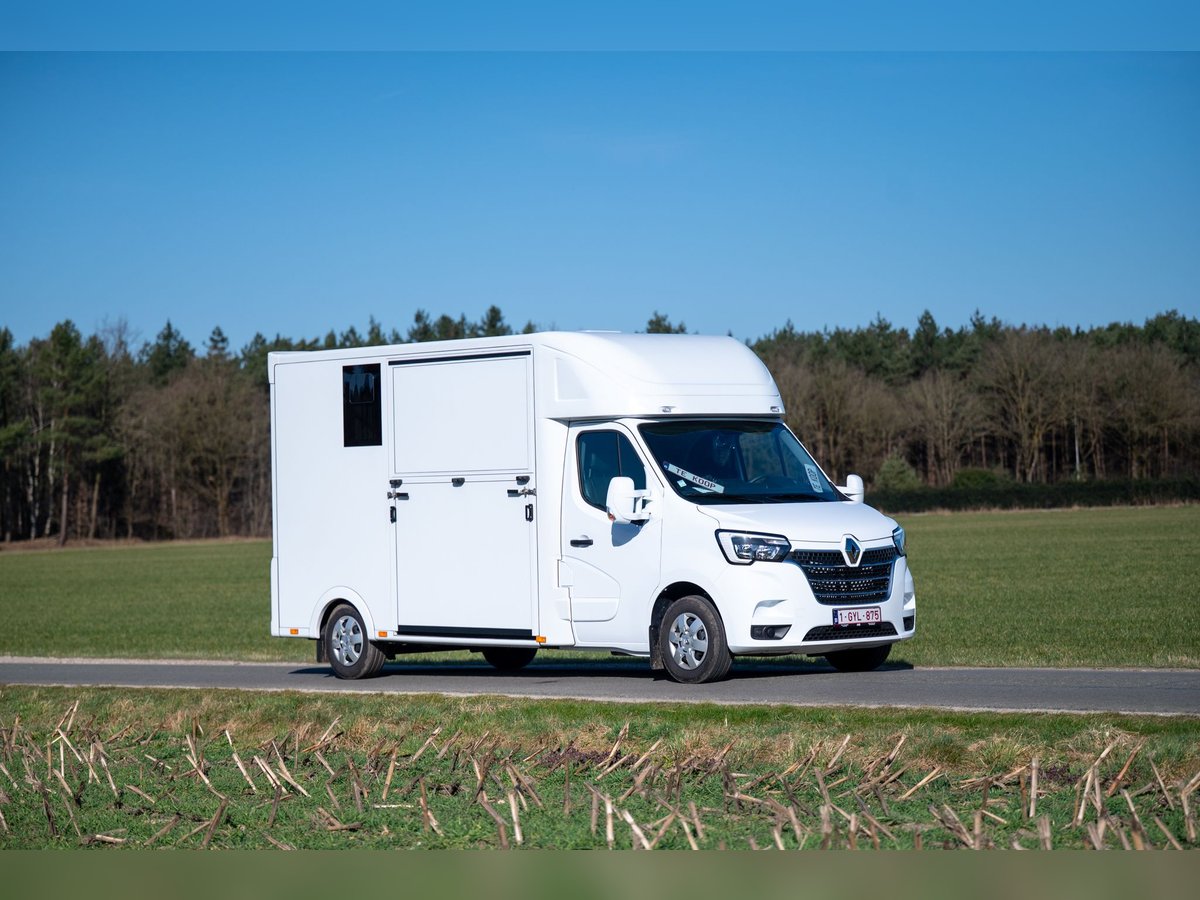 Nieuwe Ultra-light 2 paards Renault Master paardenwagen geschikt voor rijbewijs B met 1100kg laadvermogen. Uitvoering: Renault Grand Master Confort (L3), in mineraal wit, interieur aankleding in donker carbon, stoffen bekleiding "Kaleido", radiatorrosster in chroom afwerking, airco, DAB-radio, bestuurderszetel met armsteun en verstelbare lendensteun. Opbouw in hengstenuitvoering, verschuifbare tussenwand, klapbare tussendeuren, stootkussens, achteruitrijcamera en camera in laadbaak, LED verlichting laadbak blauw/wit, 2 dakluiken, dakventilator bedienbaar via cabine met temperatuur monitoring, anti-slip vloer met afloop, glas-in-glas design ramen met tralies, trekhaak 2500kg met 13-polige stekkerdoos, opstaptrede, dakspoiler met doorlaad mogelijkheid via laadbak, zijklep met kantelbaar dakluik, achterdeur, 2 zadelsteunen & 2 hoofdstelsteunen. Cruise Control optioneel mogelijk € 800 ex. BTW (in plaats van € 1600 ex. BTW) New Ultra-light 2 horse Renault Master horse truck suitable for driving licence B with 1100kg payload. Model: Renault Grand Master Confort (L3), in mineral white, interior trim in dark carbon, fabric trim ‘Kaleido’, radiator grille in chrome finish, air conditioning, DAB radio, driver's seat with armrest and adjustable lumbar support. Stallion-style superstructure, sliding partition, folding partition doors, bumpers, reversing camera and camera in loading bay, LED lighting in loading bay blue/white, 2 roof hatches, roof fan operable from cabin with temperature monitoring non-slip floor with bleed, glass-in-glass design windows with bars, 2500 kg towing hook with 13-pin socket, footboard, roof spoiler with load-through option via loading bay, side door with tilting roof hatch, rear door, 2 saddle & 2 bridle holders. Cruise Control optionally possible € 800 ex. VAT (instead of € 1600 ex. VAT) Nouvelle Camionette ultra-léger à 2 chevaux Renault Master pour permis de conduire B avec 1100 kg de charge utile. Modèle : Renault Grand Master Confort (L3), en blanc minéral, habillage intérieur en carbone foncé, habillage tissu 'Kaleido', calandre chromée, climatisation, radio DAB, siège conducteur avec accoudoir et support lombaire réglable. Superstructure de type étalon, cloison coulissante, portes de séparation rabattables, pare-chocs, caméra de recul et caméra dans la baie de chargement, éclairage LED dans la baie de chargement bleu/blanc, 2 trappes de toit, ventilateur de toit actionnable depuis la cabine avec contrôle de la température, plancher antidérapant avec purge, vitres design en verre avec barreaux, crochet de remorquage 2500 kg avec prise 13 broches, marchepied, becquet de toit avec possibilité de chargement via la baie de chargement, porte latérale avec trappe de toit basculante, porte arrière, 2 porte-selles et 2 porte-brides. Régulateur de vitesse optionnel : 800 € HTVA (au lieu de 1600 € HTVA) Neuer Ultraleichter 2-Pferde-Renault-Master-Pferdetransporter für den Führerschein B mit 1100 kg Nutzlast. Modell: Renault Grand Master Confort (L3), in Mineralweiß, Innenverkleidung in Dark Carbon, Stoffverkleidung 'Kaleido', Kühlergrill in Chromoptik, Klimaanlage, DAB-Radio, Fahrersitz mit Armlehne und verstellbarer Lendenwirbelstütze. Aufbau im Stallion-Stil, Schiebetrennwand, Falttrennwandtüren, Stoßfänger, Rückfahrkamera und Kamera im Laderaum, LED-Beleuchtung im Laderaum blau/weiß, 2 Dachluken, Dachlüfter von der Kabine aus bedienbar mit Temperaturüberwachung, rutschfester Boden mit Entlüftung, Glas-in-Glas-Designfenster mit Sprossen, 2500 kg Anhängerkupplung mit 13-poliger Steckdose, Trittbrett, Dachspoiler mit Durchlademöglichkeit über den Laderaum, Seitentür mit kippbarer Dachluke, Hecktür, 2 Sattel- & 2 Zaumzeughalter. Cruise Control optional möglich, 800 € ohne Mehrwertsteuer (statt 1600 € ohne Mehrwertsteuer)
