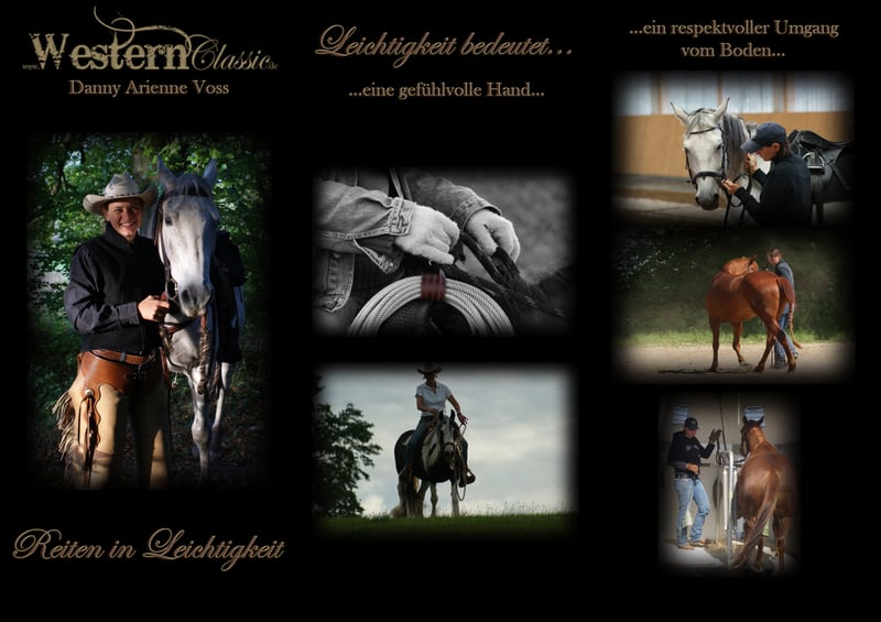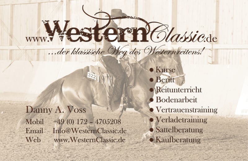 The traditional path of Western riding emphasizes riding with ease and grace. Because: "Trust and respect are the foundations of a lasting good relationship between humans and our equine partners. Therefore, ground work, fair handling from the saddle, and most importantly, giving the horse the time it needs on its journey are all very important. Because: The journey is the goal!" Danny A. Voss has worked with many legends, including serving as co-trainer to Jean-Claude Dysli, the pioneer of Western riding, and is a certified trainer B with distinction. She works very empathetically with both horse and rider, regardless of breed or riding discipline. In addition to training and riding lessons on her own horses, she also offers rehabilitation work with sport and leisure horses, ground work, loading training, and consulting around the partner horse. Danny A. Voss Pappelhof 63505 Langenselbold Mobile: +49 172-4705208 Phone: +49 6184-9958170 Fax: +49 6184-9958172 info@WesternClassic.de www.WesternClassic.de Facebook