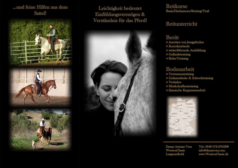 „Der klassische Weg der Westernreitkunst bedeutet Reiten in Leichtigkeit“ Denn: "Vertrauen und Respekt sind die Grundlagen einer dauerhaft guten Beziehung zwischen Mensch und unserem Partner Pferd. Deshalb die Arbeit vom Boden, der faire Umgang aus dem Sattel und vor allen Dingen die Zeit, die das Pferd auf seinem Weg braucht, sehr wichtig. Denn: Der Weg ist das Ziel!" Danny A. Voss arbeitete bei vielen Legenden, unter anderem war sie Co-Trainerin des Nestors des Westernreitens Jean-Claude Dysli und zertifizierte Trainerin B mit Auszeichnung. Sie agiert sehr einfühlsam in der Arbeit mit Pferd und Reiter, unabhängig von der Rasse und der Reitweise. Neben Beritt und Reitunterricht auf dem eigenem Pferd bietet Sie auch Reha-Arbeiten mit Pferden aus dem Sport- und Freizeitbereich sowie Bodenarbeit, Verladetraining und Beratung rund um den Partner Pferd an. Danny A. Voss Pappelhof 63505 Langenselbold Mobil.: 0172-4705208 Tel.: 06184-9958170 Fax: 06184-9958172 info@WesternClassic.de www.WesternClassic.de Facebook