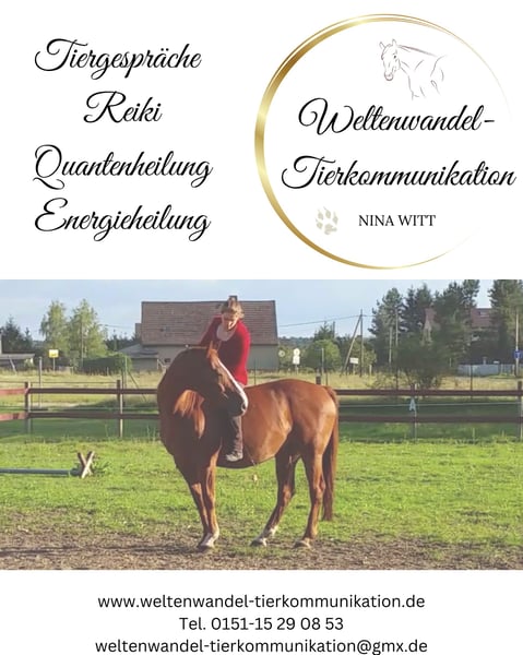 Kennst du das als Tierhalter? Du kommst in den Stall und dein Pferd steht nur noch auf drei Beinen... Dein Herz fängt an zu rasen, deine Hände schwitzen und du denkst: "Oh mein Gott, was mach ich jetzt?? Du kommst nach Hause und trittst in die Pfütze, die dein Hund dir wieder mal im Flur hinterlassen hat..... Dein Puls steigt, du wirst wütend und denkst: "Wir gehen doch schon 5x am Tag Gassi, verdammt noch mal!? Alljährlich steht Silvester vor der Tür..... Du bist schon Wochen vorher gestresst und denkst: "Nein bitte nicht. Ich weiß einfach nicht, wie ich dir da noch helfen kann.? Wir Tierhalter fühlen uns oft überfordert mit der Verantwortung, in Krankheitsfällen für unsere Tiere zu entscheiden. Wir verzweifeln in alltäglichen Situationen, in denen unsere Tieren uns mit ihrem Verhalten einfach immer wieder Rätsel aufgeben. Wir fühlen uns hilflos, wenn wir merken, dass wir unseren Tieren in ihrer Angst nicht helfen können, weil scheinbar nichts funktioniert, was wir versuchen. Was macht der Gedanke mit dir, wenn ich dir sage: "Wir können dein Tier fragen.? Hi, ich bin Nina. Als Tierkommunikatorin ist es mir möglich, mich mittels Telepathie mit deinem Tier zu verbinden. Dich habe ich dabei am Telefon. So eröffnet sich ein Raum, in dem ihr euch auf Augenhöhe begegnen könnt. In dem du all die Fragen stellen kannst, die du deinem Tier schon immer mal stellen wolltest. Ein Raum, in dem du im Austausch mit deinem Tier lösungsorientierte Wege findest. Du musst die Verantwortung für Entscheidungen nicht alleine tragen! Unsere Tiere helfen uns gern dabei und freuen sich, wenn wir sie mit einbeziehen. Vielleicht denkst du in diesem Moment ja direkt an ein Thema, dass du mit deinem Tier gern mal besprechen würdest. Bei dem du dir Unterstützung und Antworten wünscht. Ich helfe dir und deinem Schützling dabei, euch zu begegnen. Wenn du schon so vieles ausprobiert hast - von Tierarzt zu Tierarzt und von Trainer zu Trainer gelaufen bist, dann ist es vielleicht an der Zeit, mal innezuhalten und sich dem Ansprechpartner zuzuwenden, der dir vermutlich die klarsten Antworten auf deine Fragen geben kann: Deinem Tier. Im Anschluss an unser Tiergespräch bekommst du ein Protokoll des Gesprächs per Mail, um alles noch einmal in Ruhe nachlesen zu können. Wenn du dich angesprochen fühlst und neugierig geworden bist, melde dich gern bei mir. Ich arbeite mit allen Tierarten und freue mich darauf, dich und deinen Schützling kennenzulernen! Tel.: 0151 - 15 29 08 53 weltenwandel-tierkommunikation@gmx.de @weltenwandel_tierkommunikation www.weltenwandel-tierkommunikation.de Auf meinem Instagram Account @weltenwandel_tierkommunikation findest du unter anderem auch Kundenstimmen und Auszüge aus Tiergesprächen. Tierkommunikation ist übrigens auch mit verstorbenen Tieren möglich, da mit dem Tod der Zustand nur von körperlich zu körperlos wechselt, die Seele aber immer präsent und ansprechbar bleibt. Also können wir auch hier noch alle Fragen stellen, die du auf dem Herzen hast. Trau dich. Es lohnt sich! Bis dahin, Nina