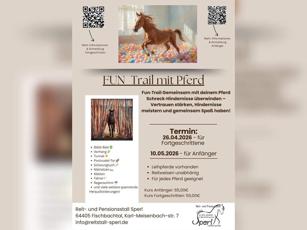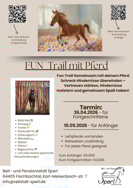Fun Trail/Gelassenheitstraining Datum: 26.04.2026 Uhrzeit: 10:00-14:00 Uhr ca 4 Stunden Programm inkl. Pause Für Kinder und Erwachsene geeignet **Vorraussetzung siehe unten** Anmeldung über das Reitbuch: https://reitstall-sperl.reitbuch.com/course.php?c=75 Entdecke den Spaß an der Zusammenarbeit mit deinem Pferd! Erlebe einen einzigartigen Kurs, der sowohl deine Reit- als auch deine Führtechnik verbessert – mit dem Fokus auf Vertrauen, Kommunikation und Gelassenheit! Der FUN-Trail fördert nicht nur die Zusammenarbeit zwischen Mensch und Pferd, sondern stärkt auch das Selbstbewusstsein auf beiden Seiten. Du wirst lernen, dein Pferd achtsam durch verschiedene Hindernisse zu führen und dabei die richtige Kommunikation zu entwickeln, besonders wenn es vor neuen Herausforderungen steht. Was dich erwartet: Begrüßung & Kennenlernen: Team- und Pferdeeinteilung FUN-Trail Hindernisvariationen: Gemeinsam die Hindernisse anschauen und zusammenstellen Besprechung der Hindernisse: Herangehensweise und Aufbau Bodenarbeitstraining: Förderung von Vertrauen und Gelassenheit Reittraining: Der FUN-Trail Parcours geritten erleben Die Teilnehmer*innen werden in zwei Gruppen (max. 4–6 Personen) aufgeteilt – 1 Stunde Bodenarbeit und 1 Stunde Reiten für jede Gruppe. Der FUN-Trail Parcours enthält u.a.: Bälle-Bad 🎾 Vorhang 🌿 Tunnel 🌟 Poolnudel-Tor 🌈 Schwungtuch 🪄 Matratzen 🛏️ Matten Fahne 🏳️ Regenschirm ☔ und viele weitere spannende Herausforderungen! Kosten: Kursgebühr pro Teilnehmer*in: 50,00€ Leihpferd (falls benötigt): +10,00€ Ausrüstung: Passende Reitausrüstung (knöchelhohe Schuhe, Handschuhe, Helm) Wichtig: Bitte sorgt für eine sichere Ausrüstung und seid auf verschiedene Wetterbedingungen vorbereitet. Voraussetzungen: Sicheres Reiten und Lenken im Schritt Sicheres Führen im Schritt