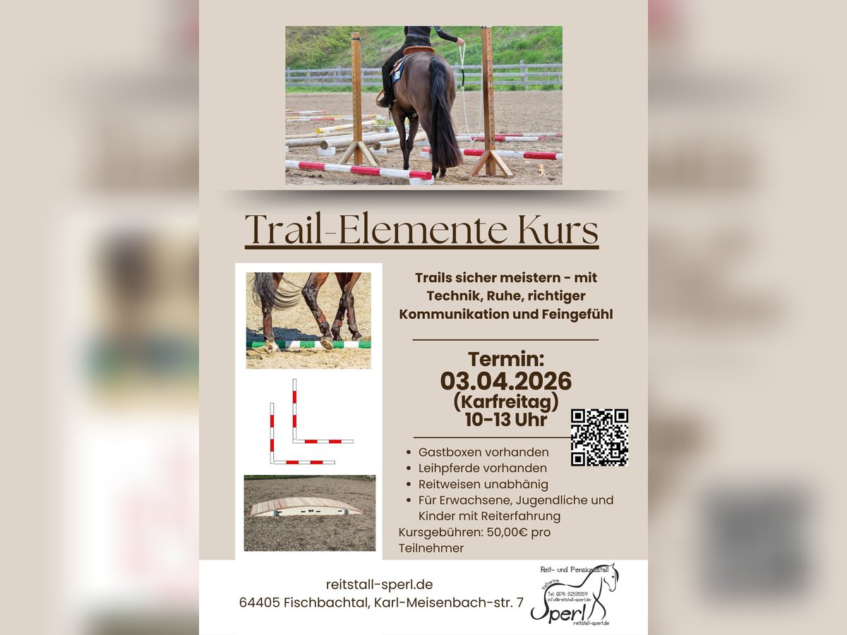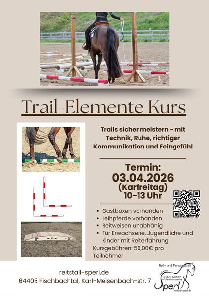 Termin: 03.04.2026 ab 10-13 Uhr Theorie danach Praxis Kursleiterin: Sabrina Henderkes - Trainer B Anmeldungen und mehr Informationen über das Reitbuch: https://reitstall-sperl.reitbuch.com/course.php?c=81 oder das untenstehehnde Kontaktformular Theorie (ca. 1 Stunde) gemeinsames Aufbauen der Trail-Elemente richtige Abstände & Linienführung Reitstrategie und Technik für jedes Hindernis Wie wird es korrekt geritten? Worauf wird besonders Wert gelegt? Wie soll es am Ende aussehen? Auf Wunsch mit einem Reiter, der vorreitet – denn: Durch Sehen verstehen. Trail-Elemente im Kurs Rückwärts-L Tor Box Rückwärtsrichten Seitwärts-L Brücke Praxis Gruppen mit max. 4 Reitern 1 Stunde Praxis pro Gruppe individuelle Hilfestellung und direkte Umsetzung der Theorie Ein Kurs für mehr Präzision, Ruhe, Vertrauen und feines Reiten – Schritt für Schritt erklärt und praktisch erarbeitet. Es stehen Leihpferde zur Verfügung