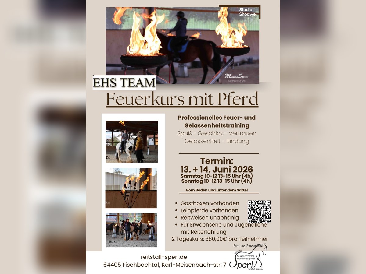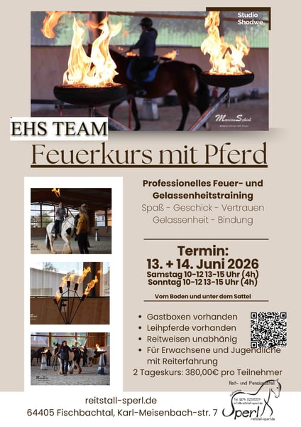 Fire Equitation Kurs Spaß, Gelassenheit, Bindung & Geschicklichkeit 13. & 14.06. 2026 Kursleitung: European Horse Show Team ehs-team.de - Home !!Begrenzt auf 8 Teilnehmer!! Buchung über das Reitbuch: https://reitstall-sperl.reitbuch.com/course.php?c=76 Das Ziel des Kurses Das Ziel dieses Trainings ist es, sich mit dem Pferd neuen Herausforderungen zu stellen - das Element Feuer gemeinsam ohne Stress kennenzulernen . Dabei ist Spaß und Freude garantiert. Das Training stärkt darüber hinaus die Bindung zwischen Reiter und Pferd und vertieft somit die vertrauensvolle Zusammenarbeit. Der Kurs eignet sich zudem hervorragend als Gelassenheitstraining. Im Kurs wird der jeweilige Entwicklungs-/Trainingsstand von Pferd & Reiter Berücksichtigung. Je nach Fortschritt können folgende Hindernisse dran kommen: Hindernisse: Umsetzten Feuerfakel 3 Feuerkelche Feuergasse 5m lang scheuerschiene Feuer Helikopter Feuerpendel Feuertisch Feuerpferch Feuerpuppe Jedes Hinderniss wird zunächst in der Gruppe einzeln kennengelernt - Ziel ist es am letzten Kurs Tag einen Fire-Equitation Parcours komplett zu durchlaufen. Samstag 10-12 13-15 Uhr (4h) Sonntag 10-12 13-15 Uhr (4h) Inhalt: Tag 1: Verschiedene Feuertrainings vom Boden aus Tag 2: Wiederholung der Übungen unter dem Sattel (Hier wird stark auf den Entwicklungs-/Trainingsstand geachtet, Übungen unter dem Reiter nicht garantiert) Gebühren: 2 Tageskurs: 380,00€ pro aktivem Teilnehmer Zuschauer: 15,00€ ggf zusätzlich Leihpferd: + 70,00€ für beide Tage Gastbox für externe Pferde/Reiter: +15,00 €/pro Pferd/ Nacht Wer kann mitmachen: Jugendliche & Erwachsene - Reitweisen unabhängig Grundkenntnisse in Bodenarbeit, Reiten und ein gewisses Vertrauensverhältnis zum Pferd von Vorteil für den Fortschritt im Kurs Anzahl Teilnehmende: Maximal 8 Teilnehmer