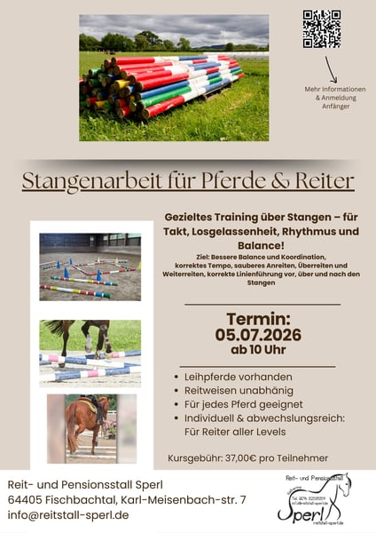 Termin: 05.07.2026 Kursleitung: Sabrina Henderkes ab 10 Uhr Buchung und mehr Informationen über das Reitbuch: https://reitstall-sperl.reitbuch.com/course.php?c=82 oder das untenstehehnde Kontaktformular Stangenarbeit für Pferd & Reiter Gezielte Stangenarbeit ist ein wertvolles Training für jedes Pferd – unabhängig von Ausbildungsstand oder Reitweise. In diesem Kurs arbeiten wir systematisch im Schritt, Trab und Galopp an Takt, Balance und korrekter Linienführung. Schwerpunkte des Kurses: Verbesserung von Takt, Rhythmus und Losgelassenheit Förderung von Balance und Koordination korrektes Tempo und passende Tempi beim Anreiten und Überreiten der Stangen sauberes Anreiten, Überreiten und Weiterreiten mit stabiler Balance korrekte Linienführung vor, über und nach den Stangen Entwicklung eines sicheren Gefühls für Abstände Verfeinerung der Reiterhilfen (Sitz, Tempo, Blickführung) Vorbereitung ist alles: richtiges Tempo vor den Stangen Nachbereitung: ruhig, kontrolliert weiterreiten Reiter lernt mitzudenken – nicht einfach „durchzureiten“ Stangengassen zur Schulung von Übergängen und Kontrolle Der Kurs wird individuell gestaltet: Der Schwierigkeitsgrad und das Vorankommen werden dem Ausbildungsstand von Pferd und Reiter angepasst. Gruppengröße: max. 4 Reiter Dauer: 60 Minuten pro Gruppe Gebühr: 37€ pro Teilnehmer Ein vielseitiger Kurs für mehr Gefühl, Präzision und harmonisches Reiten – sinnvoll für Einsteiger wie auch für fortgeschrittene Reiter. Leihpferde stehen zur Verfügung
