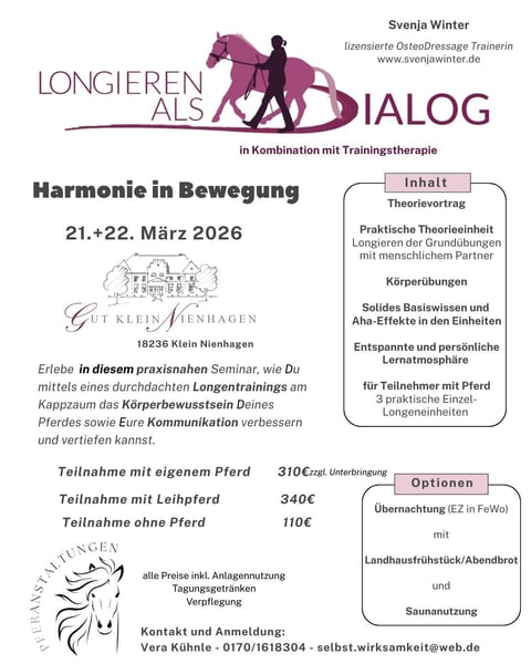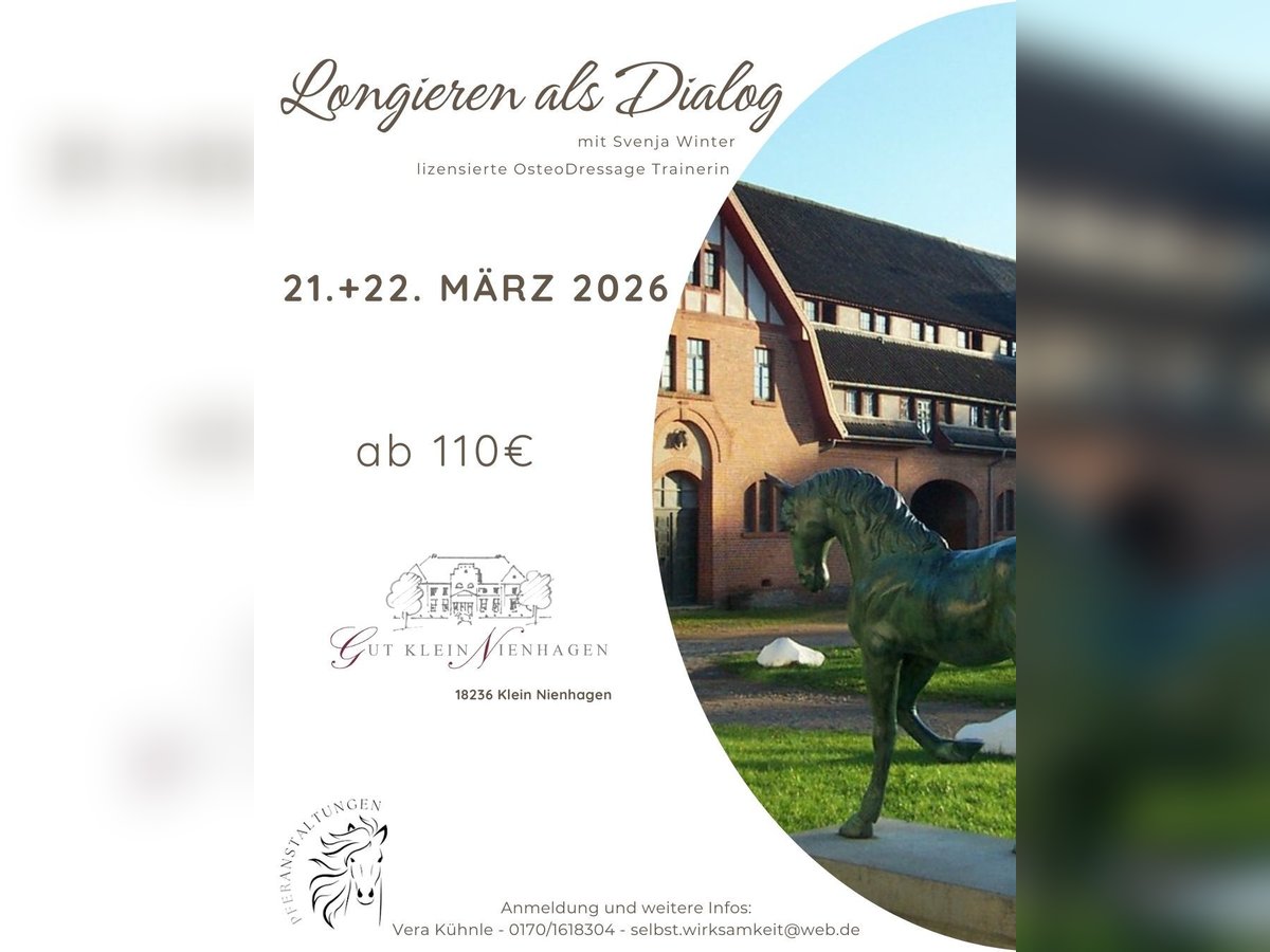 Die sinnvolle Gymnastizierung des Pferdes ist in aller Munde – ob mit oder ohne Reiter. Die lizensierte OsteoDressage-Trainerin Svenja Winter gibt im März 2026 einen 1½-tägigen Workshop auf der wunderschönen Anlage des Gutes Klein Nienhagen. Svenja unterrichtet mit Leidenschaft Pferd und Reiter im Handwerk des Longierens. Ihr Augenmerk liegt auf klug kombinierten Übungsreihen, die für das Pferd ein sinnvolles Ganzkörpertraining darstellen. Mit liebevollem Geschick leitet sie die Longierenden durch die Übungsaufgaben und gibt hilfreiche Hinweise zur eigenen Körperhaltung, -drehung und zur Einhaltung der korrekten Laufwege. Erstmalig findet der bereits bewährte Workshop auf Gut Klein Nienhagen statt. Hier stehen nach Rückfrage in begrenztem Umfang auch Leihpferde zur Verfügung. Für Teilnehmerinnen besteht außerdem die Möglichkeit, direkt vor Ort auf dem Gut zu übernachten – ein Zimmerkontingent ist reserviert. Dieser Workshop ist für Dich geeignet, wenn Du Dir für Dein Pferd ein sinnvolles Ganzkörpertraining wünschst, das folgende Aspekte vereint: Muskel- und Faszientraining, Förderung von Beweglichkeit und Stabilität, Stärkung der ventralen und dorsalen Muskelkette sowie Biegung und Geradeaus. Du bist neu oder hast noch wenig Erfahrung im Longieren? Auch dann bist Du bei Svenja an der richtigen Adresse. Mit Charme und Bestimmtheit führt sie Dich in die Grundlagen des gymnastizierenden Longierens ein. Denn stimmt die Basis, kommt der Rest fast von allein. Wie alle Pferanstaltungen findet auch dieser Workshop in kleinem Rahmen mit begrenzter Teilnehmerzahl statt, um in entspannter und persönlicher Atmosphäre zu lernen und sich auszutauschen. Maximaler Input ist gesichert: Die Teilnahmegebühr enthält den vorbereitenden Theorievortrag, die Möglichkeit jederzeit Fragen an Svenja zu stellen, Aha-Effekte während der Einheiten, die Nutzung der schönen Location, Heißgetränke und eine Pausenverpflegung. Bei Teilnahme mit Pferd bekommst Du drei Einzeleinheiten, in denen Svenja individuell und mit viel Ruhe auf Dich und Dein Pferd eingeht. Sichere Dir jetzt einen der begehrten Plätze! Teilnahme ohne Pferd 110€ Teilnahme mit eigenem Pferd 310€ zzgl. Unterbringung Teilnahme mit Leihpferd 340€