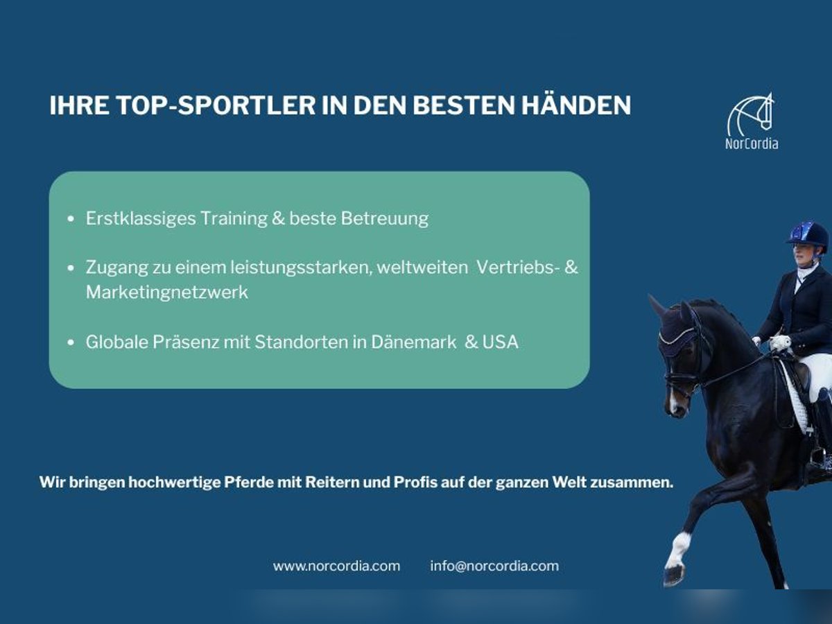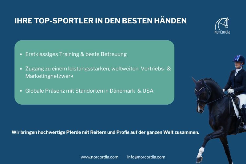 IHRE TOP-SPORTLER IN DEN BESTEN HÄNDEN - BEI NORCORDIA - Erstklassiges Training & beste Betreuung - Zugang zu einem leistungsstarken, welweiten Vertriebs- und Marketingnetzwerk -Globale Präsenz mit Standorten in Dänemark und USA ____________________________________________________________________ Möchten Sie mehr erfahren? Kontaktieren Sie das NorCordia-Team Europa: Ulrik Clemmensen: +45 2441 5012 USA: Catherine Haddad: +1 561 779 1124 E-Mail: info@norcordia.com Webpage: https://norcordia.com/consign-your-horse/