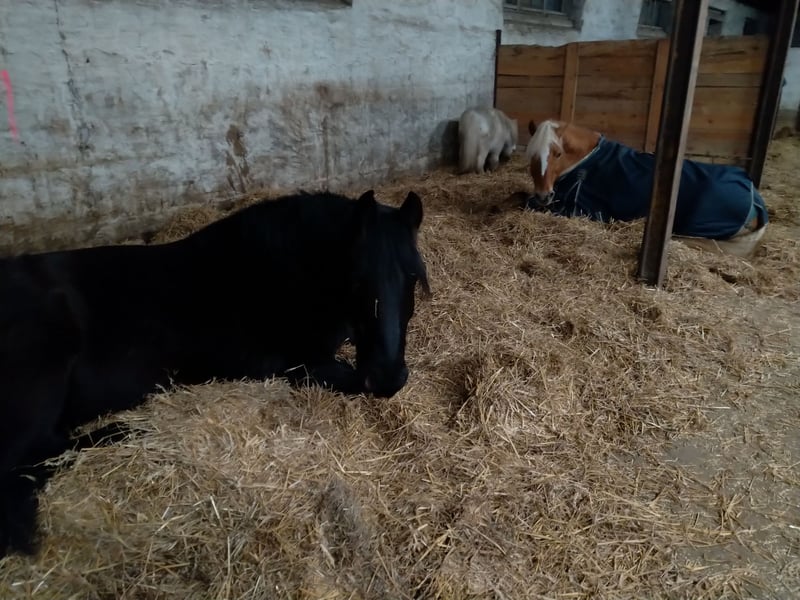 Wir bieten einen freien Platz in unserem Offenstall an, welcher als Laufstall angelegt ist. Der Außenbereich ist vollständig mit Kunstrasen ausgestattet, somit stehen die Pferde/Ponies matschfrei. Die Liegebereiche sind innen mit Stroh ausgestattet und der überdachte Außenbereich mit Kies. Beides wird gerne zum Liegen genutzt. Im Sommer stehen den Pferden/Ponies 6,5 ha Weide zur Verfügung,im Winter gibt es Heu von unseren Mähwiesen (ohne Kunstdünger). Jeder Einsteller bekommt seinen eigenen, abschließbaren Sattelschrank. Für die Arbeit mit den Pferden/Ponies haben wir: * Reitplatz 20x40, beleuchtet * Round Pen, beleuchtet * Führanlage, beleuchtet * Springplatz * schönes Ausreitgelände Für die Gesundheit und Wellness bieten wir: * Solekammer * Solarium * Bemer Horse Set Wir wünschen uns im Offenstall einen dauerhaften Einsteller,um die Herdendynamik konstant zu halten. Für Rückfragen oder bei Interesse, gerne melden.