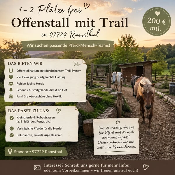 🐴 1–3 Offenstallplätze frei in 97729 Ramsthal 🐴 Wir haben aktuell 1–2 Plätze im Offenstall mit Trail frei und suchen passende Pferd-Mensch-Teams 😊 📍 Standort: 97729 Ramsthal ✨ Das bieten wir: * Offenstallhaltung mit durchdachtem Trail-System * Viel Bewegung & artgerechte Haltung * Ruhige, kleine Herde * Schönes Ausreitgelände direkt ab Hof * Familiäre Atmosphäre ohne Hektik 🐎 Das passt gut zu uns: * Kleinpferde & Robustrassen (z. B. Isländer, Ponys etc.) * Verträgliche Pferde für die Herde * Entspannte, zuverlässige Besitzer 💶 Preis: 200 € monatlich Uns ist wichtig, dass es für Pferd und Mensch harmonisch passt, daher nehmen wir uns Zeit zum Kennenlernen 🌿 📩 Schreibt uns gern eine Nachricht für mehr Infos oder zum Vorbeikommen!