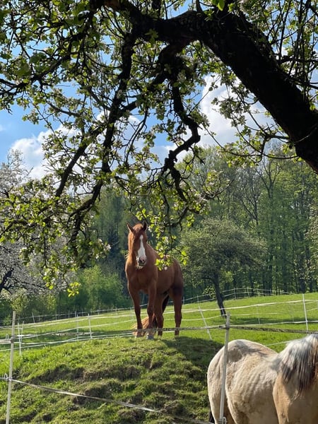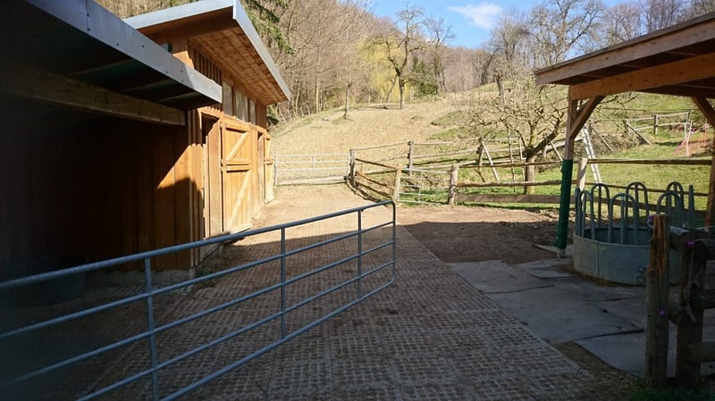 Offenstall für 1Pferde max. Stockmass 1,45m, mit Jahres Weide und 2 Boxen mit Allwetter-koppel wahlweise ohne Wiesen-Koppel oder mit Wiesen-Koppel frei.