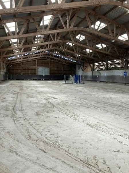 -  Un grand bâtiment avec charpente en bois accueillant un manège sol Pesson micro sable 48x22m, une écurie 20 boxes parois coulissantes avec 2 selleries, douches eau chaude et froide, un bureau, une graineterie, un club house de 96m² avec à l'étage un studio de 80 m² et une écurie de 14 boxes avec sellerie, 2 douches eau chaude et froide, un bureau et un studio.