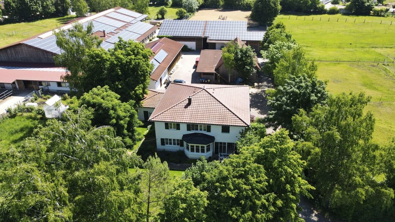 Hochwertige Reitsportanlage westlich von München Bayern, westlich von München, Richtung Bayrisch-Schwaben Fläche in Eigentum: ca. 43.520 m² Bewirtschaftete Fläche: ca. 43.520 m² Wohnfläche: großes Wohnhaus, 2 Vollgeschosse, unterkellert Anzahl der Pferde: ca. 50 Pferde Trainingsmöglichkeiten: – Reithalle 20m x 60m – Reitplatz – Führanlage mit Longierzirkel Haltungsformen: – Paddockboxen – Boxen – Laufstall OBJEKTBESCHREIBUNG: Ruhig und wunderschön eingebettet in die herrliche Wald-, Wiesen- und Seenlandschaft liegt es im direkten Naherholungsgebiet der nächstgrößeren Gemeinde. In der direkten Nachbarschaft befinden sich ein Golfplatz und mehrere schöne Badeseen. Das herrschaftliche Anwesen hat eine Größe von ca. 43.520 m² Fläche in Eigentum. Das Gebäudeensemble setzt sich aus einem edlen Landhaus mit Einliegerwohnung, Personalwohnungen an der Reithalle, mehreren Stallgebäuden, einer Reithalle mit Besuchertribüne, sowie allen Nebengebäuden, die zur Bewirtschaftung einer Reitanlage notwendig sind, zusammen. Die Trainingsinfrastruktur wird ergänzt durch eine überdachte Führanlage mit innenliegender Longierhalle und den Außenanlagen wie ein Allwetterreitplatz und schön angelegte Koppeln. Das großzügige Wohnhaus im mediterranen Stil bietet hohen Wohnkomfort und liegt eingebettet in parkähnlicher Gartenlandschaft mit altem Baumbestand. Die Erschließung erfolgt über eine private, betriebsunabhängige Zufahrt. Zum Betriebsteil der Reitanlage gehören: – Reithalle (ca. 20 m x 60 m), Reitplatz, 3 Stallgebäude, Bergehalle, Führanlage, Sattelkammern, Solarium und Waschplätze. – Für die Unterbringung der ca. 50 Pferde stehen ca. Innenboxen, Außenboxen, Paddock-Boxen sowie Laufställe zur Verfügung. Die Wirtschaftswege sind kurz und professionell durchdacht. Die Anlage wird eingerahmt von arrondierten Koppeln. Jedem Pferd steht eine eigene Koppel zur Verfügung. Das gesamte Ensemble ist blickdicht mit Baum- und Heckenreihen eingerahmt. Sonstiges: EnEv ist in Vorbereitung. Der Kaufpreis versteht sich zzgl. 3,57% Maklercourtage inkl. MwSt. Das Inventar, die Maschinen und die PV-Anlage sind nicht im Kaufpreis enthalten. Die angegebene Lage ist nicht mit dem tatsächlichen Standort identisch um die Identität nicht preiszugeben. Gerne stellen wir Ihnen ausführliche Informationen zur Verfügung. Bitte nehmen Sie Kontakt mit uns auf und stellen Sie uns Ihre E-Mail-Adresse und Telefonnummer (in der Nachricht) zur Verfügung. Vielen Dank. Weitere Bilder dieses Objektes und weitere Immobilienangebote finden Sie auf www.wir-immobilien.com W.I.R. Immobilien - Ihr Fachimmobilienmakler für Reitsportanlagen und landwirtschaftliche Anwesen