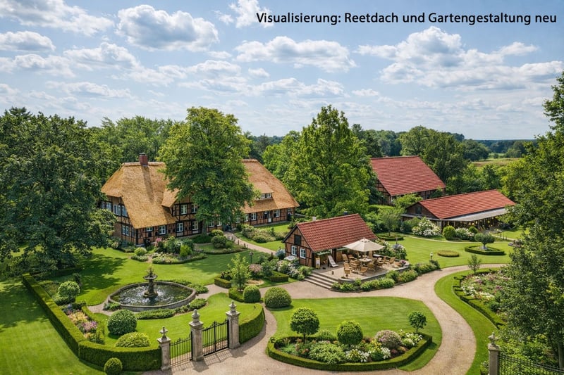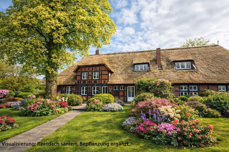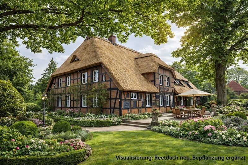 Imposantes Eichenfachwerkhaus mit Verblendausmauerung, Holzbalkendecken, Holzfenster, Holztreppe, Reetdach, Marmorböden im kompletten Erdgeschoss