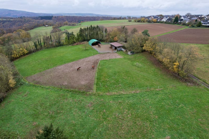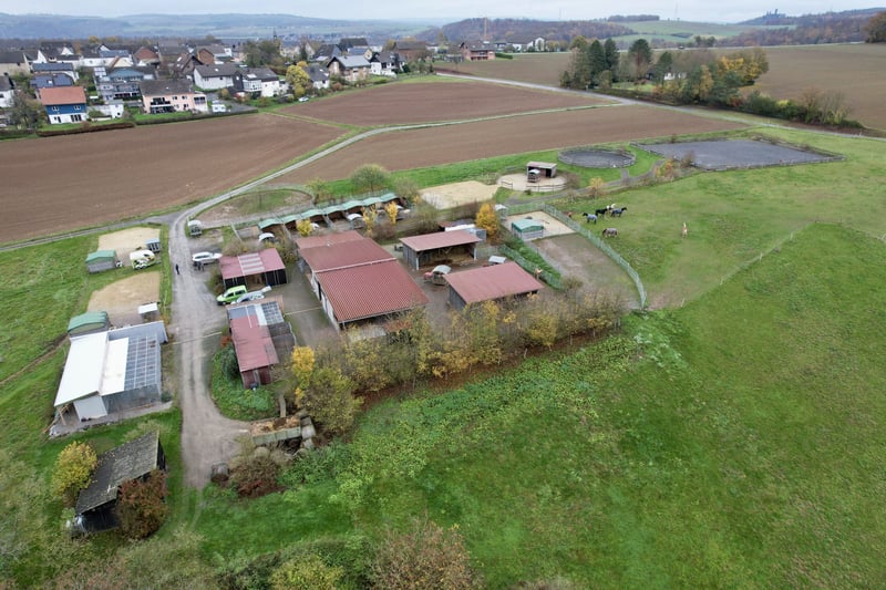 Die angebotene Reitanlage befindet sich in traumhafter Alleinlage mit beeindruckendem Fernblick. Sie erstreckt sich über ca. 17 Hektar Eigenland und bietet die Möglichkeit, bis zu 40 Hektar zusätzliche Pachtflächen zu nutzen. Die Übernahme der Pachtflächen ist optional und frei verhandelbar. In Einzelfällen kann auch der Kauf einzelner Pachtflächen geprüft werden. Ebenso ist es möglich, auf Wunsch das Objekt mit weniger Fläche zu erwerben. Bei dem Angebot über die ca. 17 Hektar Eigenland teilen diese sich wie folgt auf: • Ackerflächen: ca. 4,98 ha (davon 4.600 qm Bauerwartungsland, preislich separat zu bewerten) • Grünland: ca. 10,6 ha • Umwandlungsflächen: ca. 2,82 ha • Pachtflächen: ca. 48 ha (zur Fortführung des Betriebs möglich) Der Großteil der Weideflächen ist arrondiert und so angelegt, dass die Pferde ohne großen Aufwand auf die Flächen gebracht werden können. Optional kann zudem ein erschlossener Bauplatz (Eckgrundstück) mit ca. 760 qm gegen Aufpreis erworben werden. Grundsätzlich besteht eine hohe Flexibilität hinsichtlich der Flächengestaltung. Neben dem Erwerb der Gesamtfläche ist auch der Verkauf von Teilflächen denkbar, sofern dies den Interessentenkreis erweitert. ________________________________________ Betrieblicher Status & Personal Der Betrieb ist voll handlungsfähig und wirtschaftlich aktiv. Es konnten bereits neue Einsteller gewonnen werden, zudem ist die aktuelle Decksaison erfolgreich angelaufen. ________________________________________ Struktur und Konzept der Pferdehaltung Die Reitanlage ist für die Haltung von mehr als 80 Pferden ausgelegt. Das Konzept basiert auf modernen Erkenntnissen der artgerechten Pferdehaltung und setzt überwiegend auf Offen- und Laufstallsysteme, die den individuellen Bedürfnissen der Pferde optimal gerecht werden. Besonders hervorzuheben ist, dass viele Bereiche gezielt für die Haltung von Hengsten konzipiert wurden. Ein weiteres zentrales Merkmal ist die vollständige Befestigung aller relevanten Betriebsbereiche. Das Ergebnis ist ein Betrieb, der praktisch vollständig „matschfrei“ ist und damit ganzjährig problemlos genutzt werden kann. ________________________________________ Autarke Bewirtschaftung Die Anlage ist nicht an öffentliche Versorgungsnetze angeschlossen, wurde jedoch so konzipiert, dass sie vollständig autark und problemlos betrieben werden kann. Dies umfasst unter anderem die Versorgung mit Wasser, Energie und weiteren Betriebsmitteln. Die großen Dachflächen der Gebäude bieten zudem ideale Voraussetzungen für die Installation von Photovoltaikanlagen, wodurch eine nachhaltige Energieversorgung möglich ist. Ausstattung der Anlage Trainings- und Bewegungsflächen Die Anlage verfügt über sehr gute Trainingsmöglichkeiten für Freizeit- und Profireiter. Hierzu gehören: • Reitplatz: 40 × 30 Meter • Roundpen mit 18 Metern Durchmesser Beide Trainingsflächen sind mit einem Swingground-Allwetterboden ausgestattet und somit ganzjährig nutzbar. ________________________________________ Stall- und Weideflächen Die Unterbringung der Pferde erfolgt überwiegend in großzügigen Offenstallanlagen mit: • befestigten Ausläufen • Heuraufen • Sandplätzen Die direkte Anbindung an die Weideflächen ermöglicht einen einfachen Zugang und reduziert den Arbeitsaufwand erheblich. Zusätzlich stehen folgende Stallformen zur Verfügung: • 6 Innenboxen • 6 Außenboxen • 3 Paddockboxen • 8 große Paddockboxen mit dahinterliegenden Ausläufen ________________________________________ Weitere Ausstattung Die Anlage verfügt über zahlreiche durchdachte Funktionsbereiche: • Reiterstübchen mit Ofen, Küche und Sanitäranlagen • Großzügige Sattelkammer mit geräumigen Sattelschränken • Überdachter Wasch- und Putzplatz • Solekammer für gesundheitsfördernde Anwendungen bei Pferden • Nagerfrei konzipierte Futterkammer ________________________________________ Nutzungsmöglichkeiten und Erweiterungspotenzial Die Anlage wird aktuell unter anderem als EU-Besamungsstation betrieben und zeigt damit die große Vielseitigkeit der Nutzungsmöglichkeiten. Eine Voranfrage für den Bau einer Reithalle mit integrierter Wohnmöglichkeit wurde bereits positiv bewertet. Darüber hinaus besteht die Möglichkeit, in der direkten Umgebung Bauplätze zu erwerben, um beispielsweise ein Wohnhaus nach eigenen Vorstellungen zu errichten. Alternativ kann auch eine Mietwohnung in der Nähe genutzt werden. ________________________________________ Fazit Diese hochrentable Reitanlage in Steinsberg vereint modernes Stallmanagement, hervorragende Infrastruktur und eine außergewöhnliche Lage. Mit ihrer Kapazität von über 80 Pferden, der nahezu vollständigen Auslastung, den flexiblen Nutzungsmöglichkeiten, der autarken Bewirtschaftung sowie dem großen Erweiterungspotenzial stellt sie eine zukunftssichere und attraktive Investition für Pferdeliebhaber und professionelle Betreiber dar. Lage: Steinsberg ist eine kleine, charmante Ortsgemeinde im Rhein-Lahn-Kreis in Rheinland-Pfalz. Die idyllische Gemeinde gehört zur Verbandsgemeinde Diez und liegt in einer landschaftlich reizvollen Umgebung, die sowohl Naturfreunden als auch Ruhe suchenden Menschen viel zu bieten hat. Trotz der ruhigen Lage ist Steinsberg verkehrstechnisch gut angebunden. Die Bundesstraße B417 ist in wenigen Minuten erreichbar und ermöglicht eine zügige Verbindung zu den Städten Limburg an der Lahn (ca. 15 km) und Diez (ca. 10 km). Beide Städte bieten umfangreiche Einkaufsmöglichkeiten, kulturelle Angebote und alle wichtigen Einrichtungen des täglichen Lebens. Über die Autobahn A3, die ebenfalls gut erreichbar ist, sind Frankfurt am Main und Köln in etwa einer Stunde Fahrzeit zu erreichen. Die Reitanlage selbst liegt in völliger Alleinlage außerhalb des Ortes, umgeben von weitläufigen Wiesen und Feldern. Diese abgeschiedene Position bietet nicht nur eine unvergleichliche Ruhe und Privatsphäre, sondern auch ide