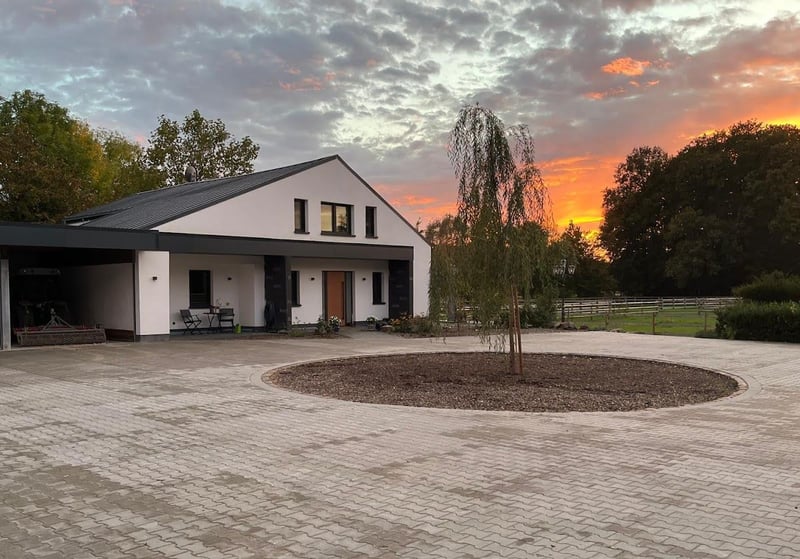 Paardenaccommodatie tussen Münsterland en Oostwestfalen – zeer goede infrastructuur voor paardenliefhebbers met uitstekende trainingsmogelijkheden, ook in de directe omgeving. Slechts 15 minuten tot het DOKR en vele bekende trainers. Het zorgvuldig gerenoveerde complex omvat een woonhuis van 226 m² inclusief een zelfstandige appartement, een dressuithal met aangrenzende stallen (5 boxen), een aparte stal (4 boxen), garages, een grote carport, een ruime buitenrijbaan inclusief kunstlicht, omheinde weilanden, zandpaddocks en meer. Na de renovatie voldoet het huis aan de KFW 70-voorschriften, inclusief zonnepanelen, watergedragen open haard, warmtepomp, drievoudige beglazing en dergelijke. Het terrein is ideaal voor professionele ruiters met een exclusieve klantenkring of voor privépaardhouderij, wanneer u de rust en het samenzijn met de paarden wilt genieten zonder in te boeten aan comfort en top trainingsfaciliteiten. Het huis is modern, hoogwaardig en gezellig ingericht. Geniet van uw tijd op een van de terrassen of in de ruime open woonkeuken met vrienden, terwijl u een vrij uitzicht hebt op de weilanden. Als u zich hier thuis wilt voelen, neem dan gerust contact met ons op voor een bezichtiging. Documenten over het huis, het energielabel en meer foto’s sturen wij u graag op aanvraag.