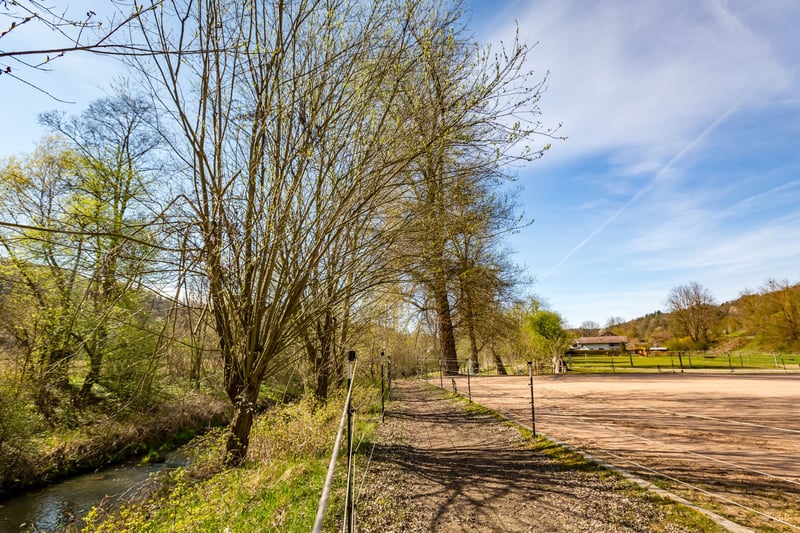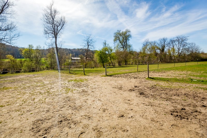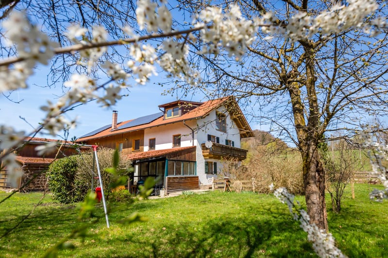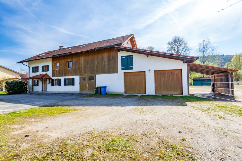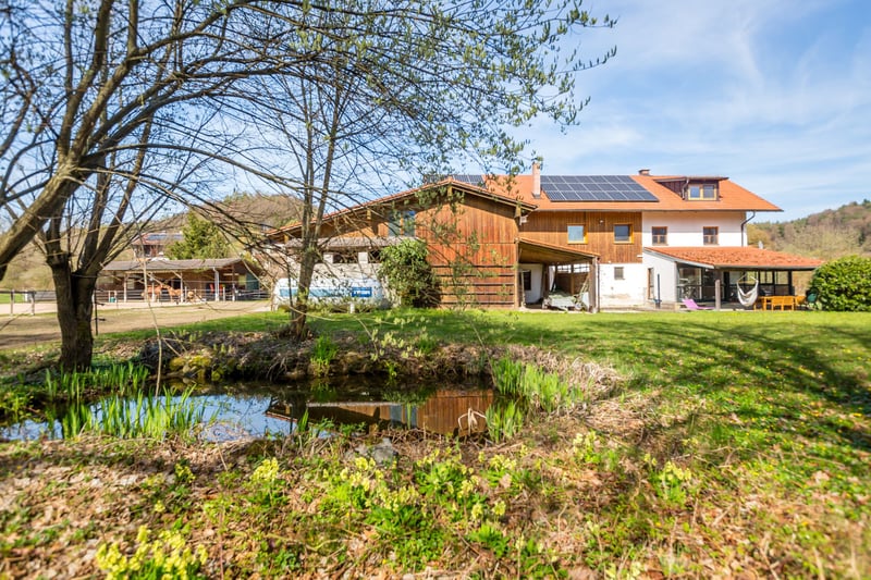 Move in, settle in, and start riding This beautifully situated estate with special charm is located on the outskirts of a village and is already ideally equipped for horsekeeping. In addition, it is excellent for self-sufficient living, freelancers, small businesses—or simply as an exceptional family home in the countryside. Located directly on the border to Upper Bavaria and connected to the A94, Munich can be reached in about an hour. Brief Description: - Idyllic outdoor location on the Türkenbach river with mature deciduous trees - Only one neighboring property - Approximately 11,006 m² of flat, well-shaped land - Fully fenced horse area with paved paddock, pastures, trail, and stables - Riding arena 20 × 40 m with high-quality riding sand, irrigation, and floodlighting - Municipal road adjacent to the property; B20 about 100 meters line-of-sight (situated higher, barely audible) - Residential house built in solid construction (original foundation circa 1955), continuously modernized and expanded - Extensive renovations (including roof and attic expansion, windows, front door, bathrooms, small sewage treatment plant) - No renovation backlog; key living areas modernized - Combination of solid exterior walls (up to approx. 48 cm) and modern timber frame construction - Parquet, plank, tile, and laminate flooring - Central liquid gas heating, underfloor heating in kitchen, dining room, and bathrooms - Tiled stove with oven and baking chamber (independently operable) as well as an additional wood stove - Public water connection and private small sewage treatment plant - Large storage area with expansion potential Layout of the Residential House: - Ground Floor: spacious living room, open new kitchen with dining area, new bathroom with walk-in shower, winter garden (unheated), covered terrace - Upper Floor: four rooms, small bathroom with bathtub and toilet - Attic: newly expanded studio 1; studio 2 prepared for expansion - Basement: storage and heating room (partially cellar) Outbuildings and Outdoor Facilities: - Spacious workshop (~48 m²), currently used as a saddle room - Two garages, one with electric roller door and e-charging station - Insulated barn/storage hall (~55 m²) for hay, straw, and horse trailer - Additional storage spaces - Equestrian lounge with view of the riding arena - Rustic hunting lodge with cellar - Shelters, fenced flower garden, pond, fire pit, fruit trees - Liquid gas tank Photovoltaic System: - 9.9 kWp PV system with 19.5 kWh battery storage (built in 2019) - Wallbox for electric vehicle charging Special Information on Horsekeeping: The developed horse area provides space for about four horses in paddock boxes or open stable management. The area was designed with expertise and attention to detail, offering optimal conditions for species-appropriate, year-round horsekeeping. - Direct access from boxes to paddock and pastures, optionally via trail - Newly fenced and Shetland-safe - Stable building with concrete floor, forest bedding, paddock plates/rubber mats - Paved, drained paddock (no mud) - Frost-proof, heated drinking trough - Covered grooming area, washing area, and concrete manure pad - Professionally built riding arena with surface drainage, specialized riding sand with irrigation, and floodlight mast for excellent training conditions - Direct access to extensive riding terrain, rides up to the Inn possible - Several riding clubs within 10–20 minutes - Equestrian lounge - Barn with ample space for hay, straw, horse trailer, and riding arena planner - Reliable hay/straw suppliers and manure pick-up service available Note on the Location Near the Creek: Although the estate is situated directly on the Türkenbach, the creek runs several meters below the property. Therefore, the estate was unaffected during the flood in 2016 and the flooding in 2024. Energy Certificate: Consumption-based energy certificate, valid until 03.04.2032 Main energy sources: liquid gas and firewood Built in 1955 Energy class G About the Area: Untertürken is a rural village in the Bavarian municipality of Zeilarn. Shopping options are available in Stammham (about 3 km, village shop, butcher), as well as in Marktl (about 5 km) and Tann (about 7 km) with supermarkets, discount stores, bakeries, butchers, pharmacies, doctors, banks, etc. The surroundings offer diverse sports and leisure activities (e.g., hiking trails, cycling routes, lakes, golf courses, thermal spas, etc.) Distances from Untertürken: - Simbach/Inn approx. 12 km - Braunau/Austria approx. 15 km - Burghausen approx. 15 km - Eggenfelden approx. 20 km - District town Pfarrkirchen approx. 23 km - Mühldorf approx. 34 km - Bad Füssing approx. 38 km - Bad Griesbach (golf and thermal spas) approx. 40 km - Passau approx. 63 km - Chiemsee approx. 65 km - Salzburg approx. 75 km - Munich Airport approx. 104 km - Munich approx. 110 km Via the A94 (Marktl exit, approx. 8 km), Munich is accessible in about an hour. Additionally, there is a very good direct train connection from Marktl station (about 5 km) to Munich—ideal for commuters. The current owners work in Munich themselves and commute several times a week.