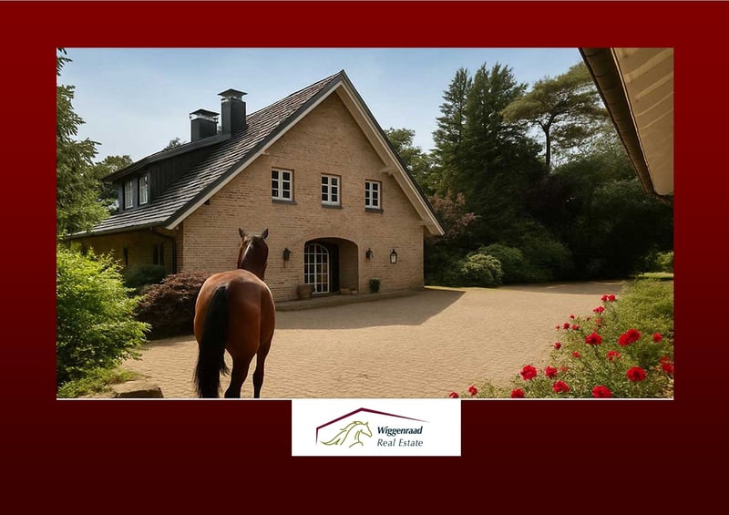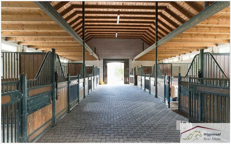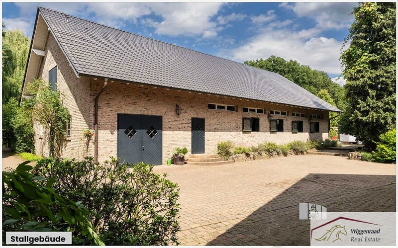 Equestrian Facility Offering the Perfect Balance Between Family Comfort and Horse Passion This estate, comprising four buildings, is set in a fully private, lush green environment on approximately 6.5 hectares nestled between forest and pastures. The main house, approximately 520 m², includes four independent living units with separate entrances. The spacious main living area, about 344 m², features an inviting open-plan kitchen with a stove fireplace and pantry in the entrance hall. An additional room combined with a barrier-free bathroom serves as a comfortable guest wing. The heart of the ground floor is the large, bright, gable-roofed living room with floor-to-ceiling windows, terrace access, and a cozy tiled stove. A small study is accessible from the living room. An authentic hardwood staircase leads to the gallery, illuminated by roof windows, which includes a library. Adjacent to the living room is a large hallway connecting to two bright children’s rooms with a full bathroom, a utility room, and a second staircase that leads to the gable-roofed master bedroom with en-suite bathroom, exposed ceiling beams, and gable view. The upper floor also hosts a staff apartment of approximately 70 m² with an open attic space, as well as a further living unit of around 100 m². All apartments have their own separate entrance. The estate is technically up-to-date, featuring underfloor heating, a bus system, modern insulated classic windows, an electronic locking system, and air conditioning in the master bedroom. An independent groundwater supply, a redundant oil heating system, rainwater drainage for the pastures, and photovoltaic potential ensure future viability and independence. For optimal horse husbandry, the facility offers excellent conditions: eight boxes in the main stable with tack room, rider’s lounge, wash bay, and feed storage. An additional ten outdoor boxes with a second tack room await new equine residents. A bright indoor riding hall with lighting, a large paddock, and several pastures with shade areas and drinking troughs provide ideal training and turnout conditions. Directly adjacent are riding paths through fields, forests, and meadows, offering year-round riding pleasure. Living at your own private estate—who wouldn’t wish for that? At this incomparable location, new happiness for you, your family, and your horses can become a reality without limits. Layout of the Niederrhein Residence Room distribution by living units with approximate living space (in m²). Note: The units are flexible and can be combined or used separately. Currently, units 1 and 2 form one entity of about 344 m²: living kitchen, wardrobe/entrance hall, kitchen, storage/pantry, guest wing, corridor, bathroom, living room with gallery/library, study, technical room, hallway, two children’s rooms, utility/technical/storage room, bathroom, master bedroom upstairs, en-suite bathroom, dressing room, storage. Unit 3 – approx. 70 m² (staff): living/dining area, kitchen, wardrobe, storage, corridor, bathroom, sleeping area, attic space (no illustration). Unit 4 – approx. 100 m² (guests/family): hallway/living/dining area, wardrobe, bathroom, two bedrooms, kitchen, storage, attic gallery. Technology: underfloor heating, contemporary country-style windows/doors, bus system, electronic locking system, air conditioning in the master bedroom, own groundwater supply, modern oil boiler (dual burner), rainwater drainage for pastures, three-chamber system. Equestrian Facility Features Main stable building with 8 horse boxes, tack room, rider’s lounge, bathroom with shower, wash bay, and feed delivery/storage area. Outdoor box system with 10 boxes, private tack room, and heated drinking troughs. Indoor riding hall with lighting (approx. 16.5 x 35 meters), adjacent hay and straw storage. Large outdoor riding arena (approx. 60 x 30 meters), five pastures with shade shelters and drinking troughs, rainwater drainage for the fields. Two separate concrete mucking pads, fruit orchard with old trees. Direct access to riding trails through the surrounding landscape in the Hohe Mark Nature Park. Special Features for Horse Husbandry: Heated drinking troughs in outdoor boxes – reliable water supply even in winter. Own groundwater supply for stables and grounds – independent and cost-effective. Rainwater drainage system for direct pasture irrigation. Direct access to scenic riding routes in the Hohe Mark Nature Park. Secluded Location in Idyllic Setting at the Lower Rhine The property is situated in a private setting within the municipality of Hünxe on the Lower Rhine in the Düsseldorf administrative district. The estate is embedded in a landscape of mixed forests, fields, and pastures. The location provides immediate access to scenic riding trails in the Hohe Mark Nature Park. Hünxe lies on the western edge of the Ruhr area, combining the best of two worlds: a rural environment with direct connectivity to the Ruhr metropolis. The community is regarded as a quiet, livable retreat in the so-called “Goldkreis” – popular among families, commuters, and those valuing quality of life. The surrounding area offers high recreational value: walks along the Wesel-Datteln Canal, through the Hünxer Bachtal or Dämmerwald are possible, as are extensive cycling tours—completely without city traffic. Leisure options include an indoor swimming pool, several tennis courts, and the Weselerwald Golf Club with an attached restaurant. The nearby 4-star Voshövel Country Hotel offers excellent wellness facilities, including the Livingroom SPA. The Hünxe Comprehensive School stands for modern education within a vibrant school community. Kindergartens are also easily accessible. We present this property in cooperation with immobilienteam.de