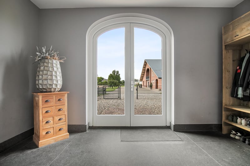 This beautiful, complete and well-maintained equestrian accommodation offers plenty of possibilities due to the presence of a beautiful luxuriously finished detached house, a total of 39 horse stables, a spacious indoor and outdoor arena (approx. 21x61 metres), a reception area, two flats which are perfect for groom's quarters, a covered horse walker and various meadows. All this is situated on a generous plot of no less than over 10 ha in an excellent, central location in the middle of the Netherlands. HOUSE The detached house has a front and back house, making it perfect for use, for example, as a main house with an extra-care residence. The front house can be reached from the hall. On the ground floor, the front house includes a living room, spacious kitchen and a utility room. The 1st floor comprises 3 bedrooms, a bathroom and a toilet. The attic space is also accessible from the front house. The back house is equipped with a living room with open kitchen, bedroom, guest room, bathroom, scullery and a toilet room. All this is situated on the ground floor. On the 1st floor, a very generous attic space is situated. THE FRONT HOUSE Ground floor: The covered entrance with a double sliding front door, gives this villa an attractive appearance. The spacious reception hall with imposing wooden staircase provides access to the living room and the 1st floor. The hall has a natural stone tiled floor, stucco walls and a stucco ceiling. The spacious living kitchen with dining area has a natural stone tiled floor, stucco walls and a stucco ceiling with recessed lighting. The kitchen features a wall-mounted unit with appliance wall and a cooking and rinsing island. The appliance wall is further equipped with an oven, coffee maker, steam oven and fridge. The island features a 5-burner gas hob with built-in extractor fan in the ceiling, a sink and a dishwasher. Various cupboards and drawers provide plenty of storage space. A large bay window/extension with French doors provide access to the garden. The many windows provide plenty of natural light. A fireplace adds atmosphere and warmth to the room. From the living room there is a nice view of the horse pastures. And here, too, large windows and double doors provide a sea of light. In addition, there is a beautiful, large fireplace with a gas fire that provides even more atmosphere and warmth in the room. Sliding doors close off the living room from the kitchen/dining area. Semi-circular French doors in the side wall of the house provide access to the front house. The spacious entrance hall provides access to the utility/laundry room, living room, toilet room and the meter cupboard. The utility/laundry room is equipped with a sink. Also located here are the connections for the washing equipment. From here, there is access to the office/workroom. The office space is a fine room which is obviously suitable for various purposes, such as a playroom or chill room. 1st floor: The spacious landing with loft provides access to 3 spacious bedrooms, the bathroom, toilet room and the attic. There is also access to a charming French balcony which offers nice views of the surrounding area. The landing and all bedrooms have the same finish, natural stone floor, stucco walls and a stucco ceiling. The master bedroom is equipped with a practical closet and air conditioning. French doors provide access to the roof terrace from here. The fully tiled bathroom is equipped with a bathtub, a bathroom unit with 2 nice washbasins and a walk-in shower. The separate toilet room has a floating toilet and a hand basin. The very generous attic space is currently mainly used as storage, but can of course also be used and furnished for various other purposes. 4 beautiful semi-circular dormer windows provide natural light and ventilation. This room houses the set-up for the central heating combi boiler (Nefit), the mechanical ventilation unit and the underfloor heating unit. A fixed staircase provides access to the rear hallway. THE BACK HOUSE Ground floor: The hall provides access to the living room, utility room, toilet room and the fixed staircase access to the attic space on the 1st floor. The underfloor heating unit is located in the stairs cupboard. The toilet room is partly tiled and further equipped with a floating toilet and a hand basin. The practical utility room is equipped with a bespoke kitchen unit. The connections for the washing equipment are located here. There is also access to the meter cupboard from here. A wicket door provides access from the utility room to the pantry/laundry room of the front house. The cosy living room with open kitchen features a natural stone floor, stucco walls and a stucco ceiling with recessed lighting. Three double French doors and a large window with beautiful and practical shutters provide plenty of natural light. A beautiful fireplace with gas fire adds atmosphere and warmth to the room. The kitchen features a wall-mounted unit with appliance wall and a cooking and rinsing island. The appliance wall is further equipped with a combination oven, coffee maker, fridge and freezer. The island features a 4-burner gas hob with wok burner and built-in extractor fan in the ceiling, a sink and a dishwasher. Various cupboards and drawers provide plenty of storage space. From the living room, there is access to the guest bedroom. This bedroom has a natural stone floor, stucco walls and a stucco ceiling with recessed lighting. From this room, there is access to the bathroom. This bathroom is finished with the same natural stone floor as in the rest of the rooms. The walls and ceiling have stucco. The bathroom is further equipped with a spacious walk-in shower with sun shower, two washbasins with cabinet, a floating toilet and a design radiator. A window provides natural light. From the bathroom, you walk further to the master bedroom. This master bedroom is equipped with a practical closet, providing plenty of storage space. A window also provid