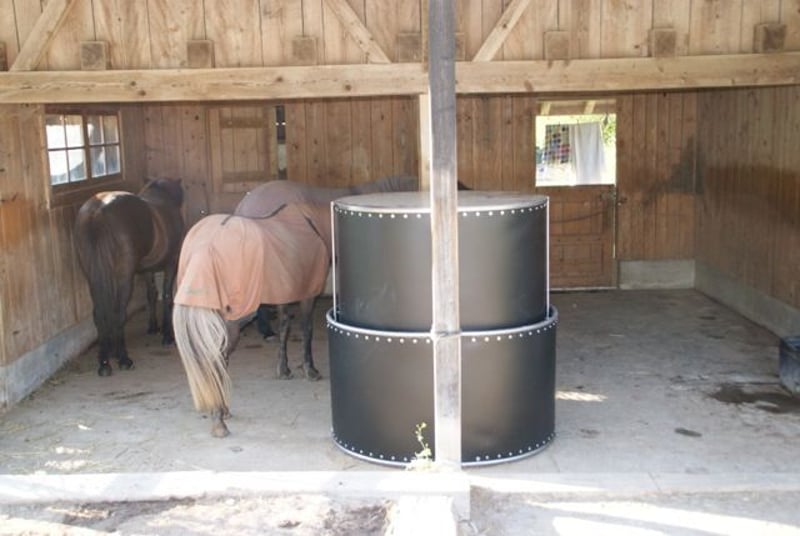 Alimentation chronométrée des chevaux ! Le râtelier en acier inoxydable vous permet de fournir à vos chevaux de petites rations de foin saines pour chevaux tout au long de la journée dans des écuries ou des stalles ouvertes. Vous avez la possibilité de remplir le râtelier avec 12 à 15 kg de foin ameubli (par râtelier demi-rond) et de le rationner facilement pendant les heures d’alimentation définies. Vous pouvez contrôler quand et pendant combien de temps les chevaux ont accès au foin. Avec jusqu’à 20 intervalles d’alimentation possibles, le rack de puissance est la garantie contre l’ennui et les comportements alimentaires incontrôlés. En option, le rack électrique est disponible avec une humidification du foin intégrée. De cette façon, vous pouvez prévenir efficacement la poussière de foin et la toux des chevaux de manière contrôlée dans le temps. Avec le râtelier H²O (y compris l’arrosage du foin), vous pouvez arroser et dépoussiérer le foin pour chaque repas. L’alimentation en foin, qui se trouve dans la partie supérieure du rack électrique, reste sèche et intacte ! Le rack électrique est le partenaire idéal dans la lutte contre les allergies à la COB, à la toux de cheval et à la poussière de foin. Les rayonnages d’alimentation, qu’ils soient ronds ou 1/2 ronds, vous sont livrés entièrement assemblés et prêts à l’emploi sur une palette Europe. Le rack d’alimentation est adapté à une utilisation en extérieur et peut être utilisé de différentes manières. Si vous avez des questions, envoyez-nous un message avec votre adresse e-mail ou appelez-nous, nous serons heureux de vous aider à tout moment. Vous pouvez en avoir un petit aperçu à l’adresse suivante : Instagram et Facebook Fabriqué en Allemagne www.bb-equipment.de