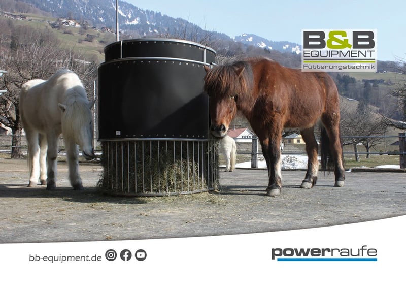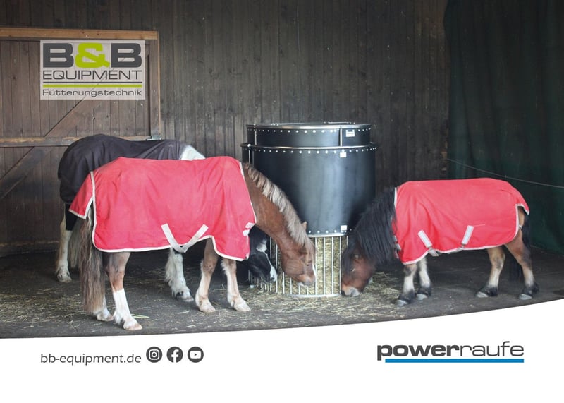 Pferde zeitgesteuert Füttern! Die Powerraufe aus Edelstahl ermöglicht es Ihnen Ihre Pferde in der Offenstall- oder in der Boxenhaltung über den Tag verteilt mit kleinen pferdegesunden Heurationen zu versorgen. Sie haben die Möglichkeit die Powerraufe mit 12 - 15 Kg aufgelockertem Heu (je Halbrundraufe) zu befüllen, und können dieses über die eingestellten Fresszeiten kinderleicht rationiert zuteilen. Sie selbst können steuern, wann und wie lange die Pferde Zugang zum Heu haben. Mit bis zu 20 möglichen Fressintervallen, ist die Powerraufe der Garant gegen Langeweile und unkontrolliertes Fressverhalten. Optional ist die Powerraufe mit einer eingebauten Heubefeuchtung erhältlich. So können Sie zeitgesteuert und effektiv gegen Heustaub und Pferdehusten vorbeugen. Mit der Powerraufe H²O (inkl. Heubewässerung) können Sie das Heu zu jeder Fütterung frisch bewässern und entstauben. Der Heuvorrat der im oberen Teil der Powerraufe liegt, bleibt dabei trocken und unversehrt! Die Powerraufe ist der perfekte Partner im Kampf gegen COB, Pferdehusten und Heustauballergien. Die Powerraufen werden ganz gleich ob Rundraufe oder ½ Rundraufe, komplett montiert und bereits einsatzbereit auf einer Europalette zu Ihnen geliefert. Die Powerraufe ist Outdoor geeignet und kann vielseitig eingesetzt werden. Bei Fragen senden Sie uns gerne eine Nachricht mit Angabe Ihrer E-Mail Adresse oder rufen Sie uns an, wir stehen Ihnen gerne jederzeit zur Verfügung. Einen kleinen Einblick gibt es bei Instagram & Facebook Made in Germany www.bb-equipment.de