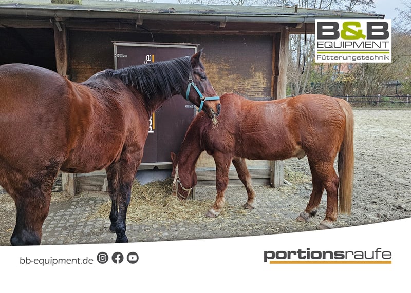 Guten Tag, der zeitgesteuerte automatischer Heuschrank für 4 Portionen zu. Mit der portionsraufe wird Ihr Pferd 24/7 optimal versorgt. Je nach Modell fasst die portionsraufe 6 - 8kg oder 10 - 12kg aufgelockertes Heu. Die Fütterungszeiten lassen sich kinderleicht einstellen. Die portionsraufe kann in der Box oder im Außenbereich stehen. An einer portionsraufe haben 2 oder 3 Pferde/Pony Platz, um in Ruhe ihr Heu zu fressen. Das Heu wird auf 4 Lagen verteilt und wird zu eingestellter Zeit freigegeben. Natürlich lassen sich auch andere Futtermittel wie z.B. Äpfel und Möhren füttern. Wir sind Ihr Partner für die zeitgesteuerte automatisierte Fütterung ihrer Tiere, ob Kraftfutter oder Raufutter. Wir freuen uns auf Ihre Nachrichten! B&B equipment GmbH Made in Germany