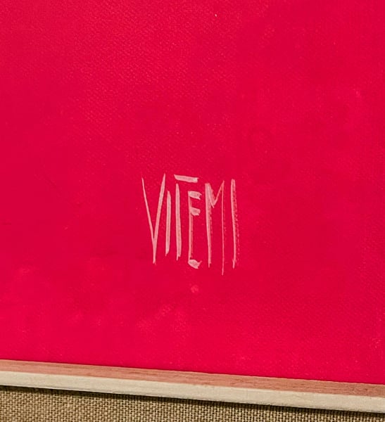 Affascinante dipinto originale della pittrice italiana Roberta Vitemi, artista nota per la sua capacità di catturare l'energia e il vigore del mondo equino. L'opera, risalente al periodo 1970-1980, è un esempio emblematico dello stile "fiammeggiante" dell'autrice. Soggetto: Due cavalli resi con un tratto bianco / chiaro tipico dell'autrice che dona movimento e vigore ai soggetti dinamici e vibranti che emergono con forza da un fondo rosso lacca saturo. Tecnica: Olio o tecnica mista su tela. Dimensioni della tela: 50 x 70 cm. Dimensioni totali (con cornice): 62,5 x 83 cm. Profondità della cornice: 5,5 cm (cornice importante e profonda che dona grande tridimensionalità). Stato di conservazione: Eccellente. Colori vividi, tela perfettamente tesa. La cornice originale dell'epoca presenta minimi e fisiologici segni del tempo che ne confermano l'autenticità. Autenticità garantita: L'opera è firmata sul fronte in basso a destra. Sul retro della tela è presente il timbro originale di autenticità dell'artista con sigla autografa di verifica, elemento fondamentale che ne certifica l'originalità e ne tutela il valore nel tempo. Un pezzo d'arredamento di grande carattere, perfetto per valorizzare ambienti moderni, studi professionali o collezioni di arte equina e modernariato italiano. Il quadro viene venduto completo della sua cornice originale dell'epoca, inclusa nel prezzo, che ne esalta lo stile vintage. Un pezzo d'arredamento di grande carattere, perfetto per saloni o studi. "Eredità familiare, quadro conservato con cura in ambiente asciutto e non fumatori". --------------------------------------------------------------------------------------------------------------------------------------------- Stunning original painting by the Italian artist Roberta Vitemi, renowned for her ability to capture the energy and vigor of the equine world. This piece, dating back to the 1970s-1980s, is a quintessential example of the artist's "flaming" style. Key Features: Subject: Two horses rendered with a dynamic and vibrant white stroke that emerges powerfully from a deep, saturated lacquer red background. Technique: Oil or mixed media on canvas. Canvas Dimensions: 50 x 70 cm. Total Dimensions (including frame): 62.5 x 83 cm. Frame Depth: 5.5 cm (a significant, deep frame that provides great three-dimensionality). Condition: Excellent. Vivid colors, perfectly taut canvas. The original vintage frame shows minimal and natural signs of age, confirming its authenticity. Guaranteed Authenticity: The work is signed on the front (bottom right). On the back of the canvas, there is the artist's original stamp of authenticity, along with a handwritten verification mark, a fundamental element that certifies its originality and protects its value over time. A high-character piece of decor, perfect for enhancing modern interiors, professional offices, or collections of equine art and Italian mid-century design. "Family inheritance; painting carefully preserved in a dry, smoke-free environment."