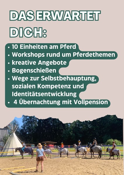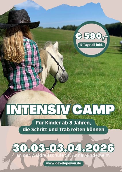 Das Intensiv Camp richtet sich an Kinder und Jugendliche ab 8 Jahren, die bereits frei im Schritt und Trab reiten können. An fünf Tagen werden mit Ihnen in Kleingruppen an ihren Fähigkeiten rund ums Reiten gearbeitet und sich intensiv auch mit dem eigenen Selbst auseinander gesetzt. Es erwarten euch: + 10 Einheiten am Pferd (Springen, Trail, großer Ausritt, …) + Workshops rund ums Pferd + kreative Angebote + Bogenschießen + Wege zur Selbstbehauptung, sozialer Kompetenz und Identitätsentwicklung Ziel ist nicht nur das reiterliche Vorankommen, sondern auch, sich mal Zeit zu nehmen um herauszufinden wer man eigentlich ist und was einen ausmacht. Dazu fördern wir gezielt und spielerisch folgende Fähigkeiten: + Zuzuhören und Gehör zu finden + Grenzen zu setzen und Grenzen zu wahren + Ziele zu finden und sich für ihre Erreichung einzusetzen Kostenpunkt sind € 590,- die 4 Übernachtungen mit Vollverpflegung beinhalten. Los geht es am ersten Tag um 10 Uhr am Hof und die Kinder können am letzten Tag um 16 Uhr wieder abgeholt werden. Veranstaltungsort ist die idyllisch gelegene Waldreitschule Litte Horse Ranch St. Anna bei Mindelheim. Anmeldung über die Homepage unter https://www.developeyou.de/Kontakt/Anmeldung-Reitcamp/