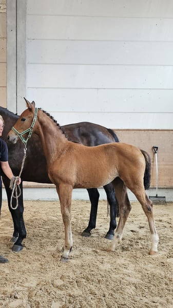 FInchen is a friendly and noble filly by the stallion Für immer Du, who is S successful up to St. George. At the Mecklenburg Elite Foal Championships, this smart foal won over the jury. With 82 points (9.5 for breed and sex type), Finchen won the competition in the Dt.R. class.