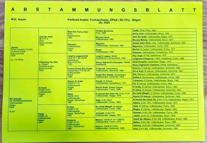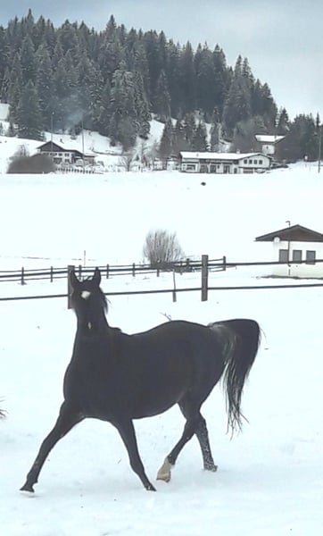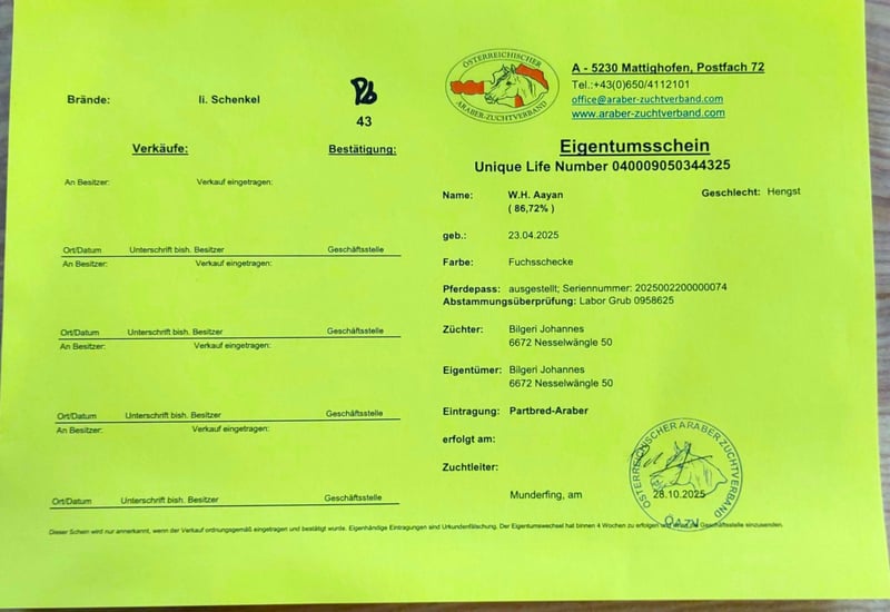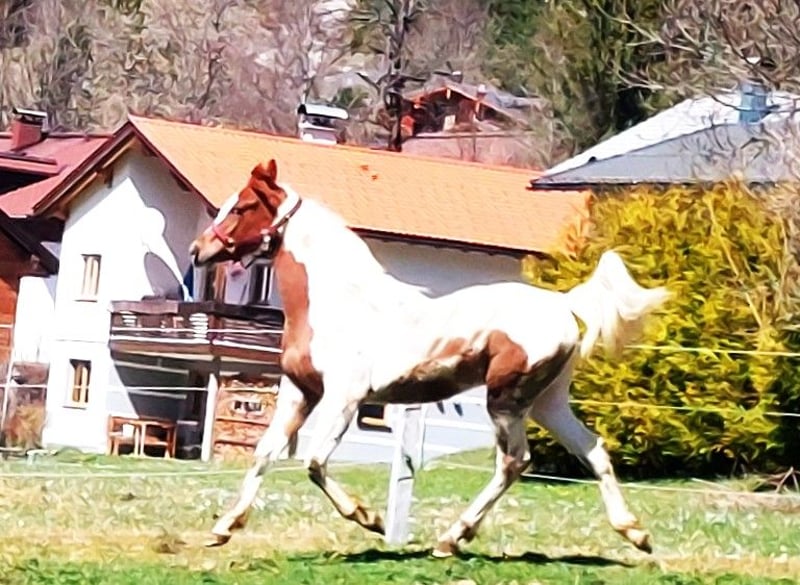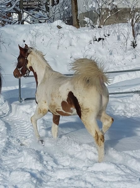 Zum Verkauf steht „WH Aayan“ unser wunderschöner arabischer Partbred Fuchsscheck Jährling, geboren 23.4.2025. Dieser charmante Fuchsschecke besticht durch sein auffälliges Erscheinungsbild und seine freundliche, ausgeglichenes Wesen. WH. Aayn hat mit knapp einem Jahr bereits ein Stockmaß von 142 cm, was ihn mit seinem geschätzten Endstockmaß von ca. 158-160 cm auch für größere Reiter, die den arabischen Typ suchen ein sehr interessanter Freizeitpartner werden lässt. Er eignet sich bestens für den gehobenen Freizeitreiter oder Distanzreiter, da seine Elter bereits sehr erfolgreich im Distanzsport gingen. Er wird mal ein zuverlässiger und vielseitiger Freizeitpartner mit einem sehr angenehmen und cooles Wesen. Er hat das Potenzial, ein treuer Begleiter für gemütliche Ausritte, oder längere Distanzritte in der Natur zu werden. Er ist bei Abgabe geimpft, mehrfach entwurmt, lässt sich anhängen, Hufe auskratzen, ist Halfterführig. WH Aayan hat volle Abstammungspapiere und Pferdepass vom österreichischen Araberzuchtverband. (ÖAZV) Wenn Sie auf der Suche nach einem sehr typvollen und absolut coolem Fuchsscheck Zum Verkauf steht „WH Aayan“ unser wunderschöner arabischer Partbred Fuchsscheck Jährling, geboren 23.4.2025. Dieser charmante Fuchsschecke besticht durch sein auffälliges Erscheinungsbild und seine freundliche, ausgeglichenes Wesen. WH. Aayn hat mit knapp einem Jahr bereits ein Stockmaß von 142 cm, was ihn mit seinem geschätzten Endstockmaß von ca. 158-160 cm auch für größere Reiter, die den arabischen Typ suchen ein sehr interessanter Freizeitpartner werden lässt. Er eignet sich bestens für den gehobenen Freizeitreiter oder Distanzreiter, da seine Elter bereits sehr erfolgreich im Distanzsport gingen. Er wird mal ein zuverlässiger und vielseitiger Freizeitpartner mit einem sehr angenehmen und cooles Wesen. Er hat das Potenzial, ein treuer Begleiter für gemütliche Ausritte, oder längere Distanzritte in der Natur zu werden. Er ist bei Abgabe geimpft, mehrfach entwurmt, lässt sich anhängen, Hufe auskratzen, ist Halfterführig. WH Aayan hat volle Abstammungspapiere und Pferdepass vom österreichischen Araberzuchtverband. (ÖAZV) Wenn Sie auf der Suche nach einem sehr typvollen und absolut coolem Fuchsscheck Hengstfohlen sind, dann ist WH Aayan genau das Richtige für Sie! Sein Vater "Jameel" ist auch kein unbekannter, er war in seinem Jahrgang Körungssieger und Reservesieger der Hengstleistungsprüfung (30-Tage Prüfung). Er hat auch Distanzritte und Distanzfahrten bis 80 Km sehr Erfolgreich absolviert. Auf den letzten Bildern sehen Sie die Mutter Asaalah und den Vater Jameel. Bei den Bildern von Jameel sehen sie seine Vielseitigkeit, ob in der Kutsche, auf dem Fahrturnier, auf dem Distanzritt oder bei dem Wanderritt auf dem Gipfel auf über 2000 m Seehöhe. Also an Allrounder wie man sich nur wünschen kann, der diese Zuverlässigkeit auch seinen Kindern weitergibt. Bei Interesse oder für weitere Informationen freuen wir uns über Ihre Nachricht. **************www.waeldnerhof.com************