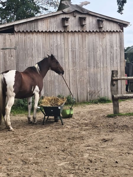Hübscher Paint Wallach sucht das passende Zuhause 13 Jahre alt, 1,55 groß Er ist super fein zu reiten, hört gut auf Stimme und reagiert auf die kleinsten Hilfen. Reiterlich ist er am liebsten im Gelände unterwegs alleine oder in der Gruppe, hier bringt er ein gutes Go mit ist aber kein Durchgänger. Reiten in der Halle ist nicht so sein Fall. Er hat sehr viel Spaß an der Bodenarbeit und kann auch schon einige Tricks so wie Podest, freies Zirkeln, Faust-Check mit Vorderbein, Dreh-Dich.. Würde sich auch perfekt fürs Wanderreiten eignen. An Reiterrallys hat er auch viel Spaß. Wasser ist sein Element. Ich war schon oft mit ihm zum Schwimmen und im 5-Tägigen Urlaub in der Lüneburger Heide mit Hund bei fuß. Tierarzt und Schmied sind kein Problem. Für unsere Touren hat er vorne geklebte Duplos getragen um die Hufe zu schonen. Verladen klappt sehr gut mit Ruhe. Bento ist rangniedrig, er steht in einer gemischten Herde im Offenstall, dies würde ich mir für ihn auch wieder wünschen. Wobei Nachts Box auch kein Problem darstellen würde. Er brauch etwas Zeit um Vertrauen aufzubauen. Und testet Fremde anfangs, da muss man mit umzugehen wissen. Pferdeerfahrung wäre daher gut. Leider ist er garnicht für kleine Kinder geeignet, diese überfordern ihn schnell. Etwas größere Kinder sind kein Problem diese können ihn auch reiten. Bento braucht eine feste Bezugsperson, mit ständigen Wechseln kommt er nicht gut zurecht. Ein Kennenlernen ist jederzeit möglich. Um Reittourismus vorzubeugen würde ich bei einem Ausritt 30€ nehmen. Diese werden dem Kaufpreis natürlich angerechnet. Freue mich von euch zu hören:)
