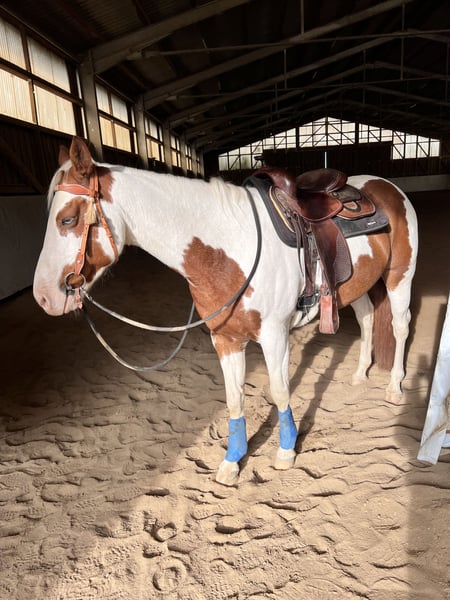 Nach langem überlegen gebe ich aus privatlichen Gründen meinen 14 jährigen Paintmix Wallach in gute Hände ab. Er ist wirklich ein lieber Schatz und sehr menschenbezogen er macht alles mit. Er hat ein Stockmaß von 1.50 cm und wird westernfreizeit geritten. Leider habe ich ihn die letzte Zeit nicht mehr so geritten deshalb müsste man das alles wieder antrainieren aber das ist alles kein Problem bei ihm. Beim angaloppieren macht er immer wieder gerne einen Freudensprung deshalb nicht für Anfänger geeignet. Beim ausreiten geht er gut in der Gruppe alleine muss man kosiquenz sein aber dann funktioniert es alles perfekt. Kennt Halle Platz und Roundpen. In der Herde ist er sehr rangniedrig geht jedem Streit aus dem Weg. Derzeit lebt er im Offenstall mit 24/7 Heu kennt aber auch Box mit täglichem Weidegang. Er hat alle seine Impfungen, entwurmungen und geht regelmäßig zum Hufschmied. Leider besitzt er ein Handicap und zwar hat er eine Zyste im Strahlbein deswegen hat er vorne duplos drauf da kommt er sehr gut zurecht. Wenn er zu arg belastet wird tickt er vorne. Bei ernsthaftem interesse freue ich mich auf Antworten. Zubehör kann mit erworben werden
