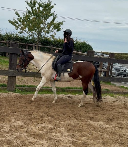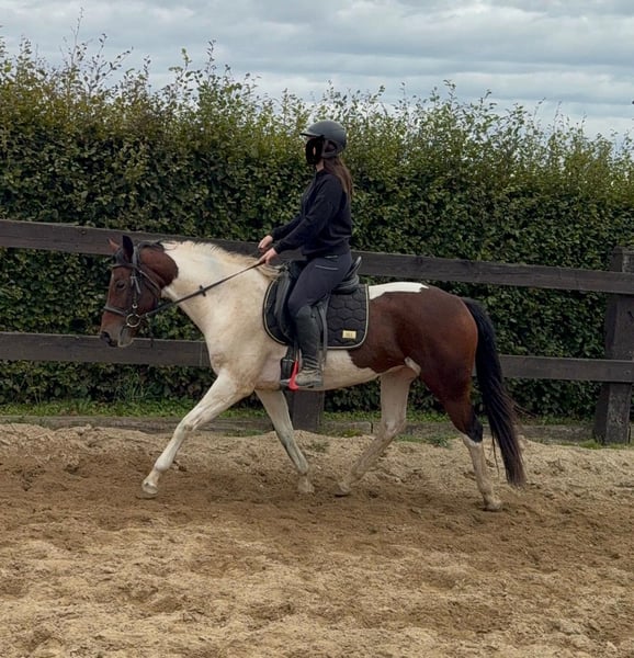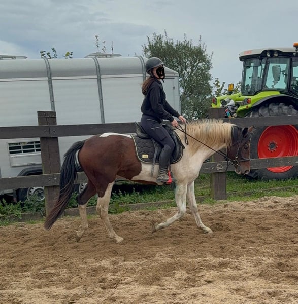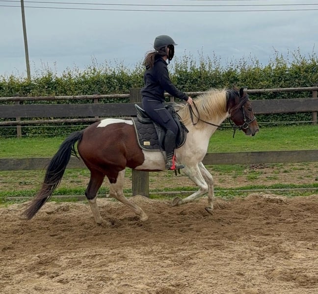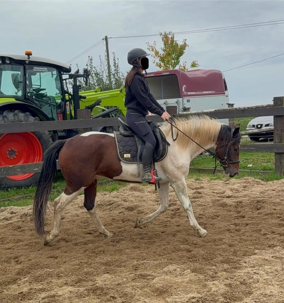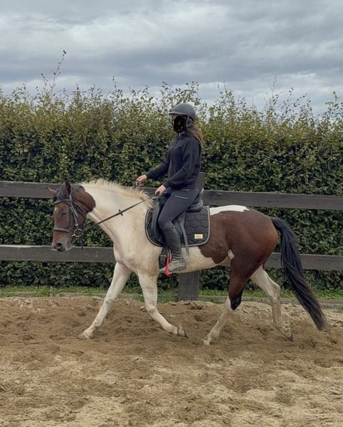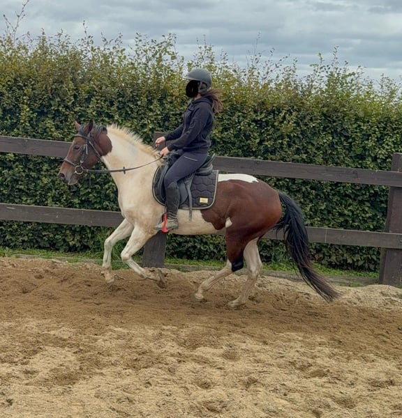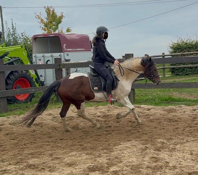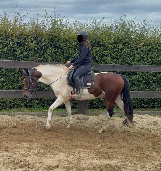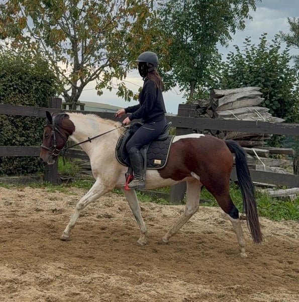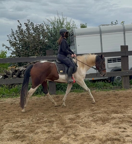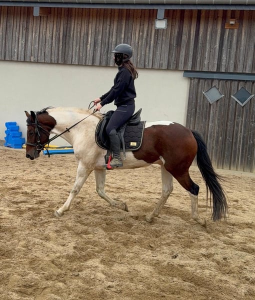Zum Verkauf steht ein 4 Jahre alter, etwa 154cm großer Pinto Wallach mit Abstammung vom ZSSE. Er ist freizeitmäßig in allen Gangarten im Gelände und auf dem Reitplatz geritten und zeigt sich mit Reiter absolut brav und gelehrig. Er war auch schon alleine im Gelände und íst eher der coole Typ. Auch im Umgang ist er brav, manchmal noch etwas verspielt. In der Herde zeigt er sich verträglich und kann auch robust gehalten werden. Er wäre auch sehr gut als Westernpferd geeignet, da er die Ausrüstung und Hilfen kennt. Er befand sich zum Anreiten in professionellem Westernberitt. Krankheiten oder Allergien sind nicht bekannt. Eine AKU darf gerne gemacht werden. Für das Probereiten, Vorreiten oder anderes Ausprobieren des Pferdes berechnen wir 35€. Beim Kauf wird dies gutgeschrieben. Gerne anrufen oder eine Nachricht senden 0157 36803742 Alle Angaben ohne Gewähr, Preisänderungen vorbehalten, Transport möglich, Onlinekauf möglich