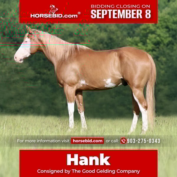 ♦️ 𝐭𝐡𝐞 𝐒𝐞𝐩𝐭𝐞𝐦𝐛𝐞𝐫 𝑺𝒆𝒍𝒆𝒄𝒕 ♦️ Happening now thru MONDAY | SEPTEMBER 8th - Available EXCLUSIVELY on HorseBid's website! For more details and to register visit: www.Horsebid.com CONSIGNOR CONTACT: The Good Gelding Company 903-275-0343 LOCATION: Athens, TX BREED: Pinto/quarter horse REGISTERED: Yes REGISTERED NAME: RS Hank COLOR: Sorrel overo with bald face HEIGHT: 15 AGE: 9 GENDER: Gelding If you’re looking for a true all-around partner with looks, brains, and talent, meet Hank. This striking 9-year-old, 15 hand overo gelding with a bald face has the kind of presence that turns heads everywhere he goes, but it’s his mind and ability that really make him special. Hank rides both English and Western with ease. He’s soft in the bridle, responsive to the aids, and happy to adjust whether you’re working in a snaffle or a western bit. He knows how to collect up and move on contact, but he’s also happy to just go along on a loose rein. This gelding is as solid as they come on the trails. He will cross water, logs, and rough terrain without hesitation. He can open and close gates to make pasture riding easier. He’s sure-footed, confident, and not easily spooked, making him a safe choice for riders who want to relax and enjoy the ride outside the arena. Hank has a real knack for jumping. He’s brave, careful, and naturally talented over fences. He doesn’t rush, he has good form, and he enjoys the job. Whether you’re interested in low-level eventing, hunter/jumper shows, or just adding variety to your rides, Hank is a horse you can enjoy in any arena. Hank is level-headed, kind, and willing. He’s the same horse whether you ride him every day or give him a week off. He’s sensible enough for an amateur but talented enough for someone who wants to keep progressing. He is easy to catch on pasture and he is polite and respectful in a stall. He loves to play with his pasture mates, but he is not too rough and gets along with a herd. With his flashy markings, versatile training, steady brain, and athletic ability, Hank truly is the type that can go in many directions. He’s ready to be someone’s best friend, show partner, and trusted trail buddy all in one