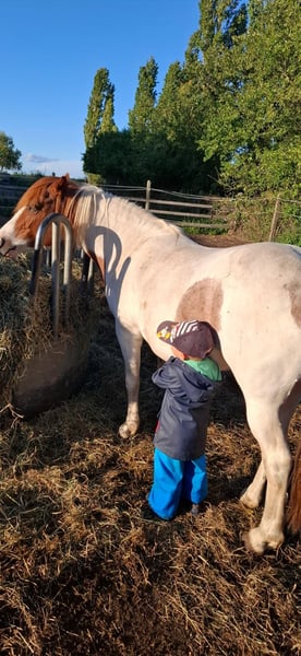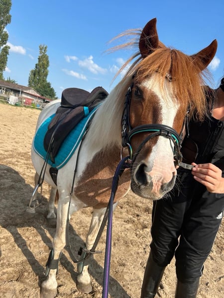 Hello, I am Pauline Blue Eyes, but you can call me Xanti. I am a Pinto mare, approximately 1.33 m tall, born in 2015, making me 10 years old, and I have a chestnut coat with white markings. I am familiar with being in a box, but I currently live in a mixed herd in a paddock, and I would prefer to stay that way. I get along fine with Shetlands or larger horses; I am rather low in the hierarchy and adapt to any situation. I am looking for my person, someone with time and patience for me. Sometimes I can be a typical pony with a stubborn streak and prefer to do my own thing. On other days, I am very sweet and allow myself to be lunged and ridden at the walk, trot, and canter. I generally enjoy jumping. Since my current family has little time for me and I really need regular training, with assertiveness yet a lot of calm and love, they have made the difficult decision to find a new, experienced home for me where I can receive the attention I seek and need. The farrier is no problem for me (barefoot), I enjoy being groomed, and I willingly go into the trailer. Here, I have hay 24 hours a day and pasture in the summer. Leading along the road, tractors, trucks, and motorcycles are not an issue for me. Generally, I am quite fearless and go in and through everything. Therefore, I also need a securely fenced paddock and a pasture with electric fencing. That should generally be the case, but I prefer to mention it again. For further questions, please feel free to contact my family at 0172 53 63 327. I look forward to meeting you!