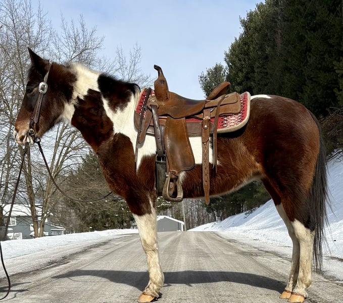 This is "DIXIE", a beginner, novice, and family friendly paint mare that anyone can ride. This mare is extra quiet, obedient, well mannered, and gentle. She is 12 years old and stands 14.3 hands tall. She has been ridden by children and novice adult riders without any difficulty. She has a nice one hand neck rein, a one stop lope, an easy stop, and a nice jog. She has a collected canter that is very easy to sit and she will lope circles. She will not go any faster than what is asked of her and rides cool, calm, and level headed. She has been in holiday parades and ridden by youth riders in the costume classes. She is gentle to be around, civilized, and very tame. She unloads in new surroundings and rides off as if she has been there many times before. She will cross the little streams, go through the deep water, and ride out alone with confidence. If you want a nice family horse that anyone can ride without difficulties, don't miss out, She’s the hard to find kind with color, ability, sense, and a solid foundation of training that makes her user friendly and easy to ride.