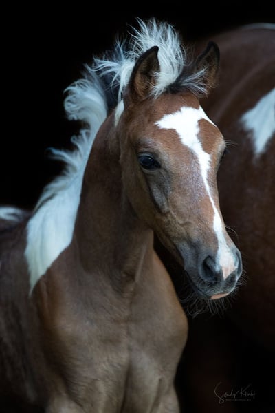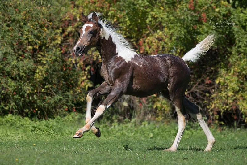 Pintabian veulen met ruime bewegingen en voortreffelijke uitstraling. Ideaal voor fokkerij en recreatie. Tobiano bruinbonte. Lief in de omgang.