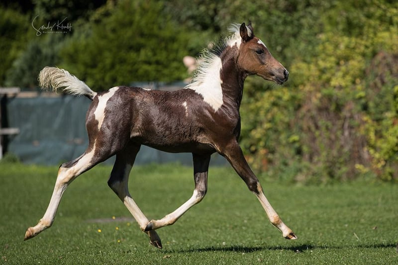 Pintabian Fohlen mit raumgreifenden Bewegungen und vorzüglichem Ausdruck. Ideal für Zucht und Freizeit Tobiano Braunschecke Lieb im Umgang