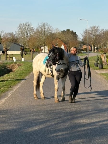 Lucky ist eine in den Niederlanden geborene Tinker/Pintomerrie, blauwbunt gefärbt und mit einer schönen Pony-typischen Körperhaltung. Sie ist derzeit etwa 1,47 m groß und wächst noch. Sie ist AES-registriert (Blaues Papier), ihre Mutter ist Tinka. Lucky ist eine junge Stute von 3 Jahren und befindet sich noch in der Entwicklungsphase. Wie bei jedem jungen Pferd ist es wichtig, dass sie weiterhin von einer erfahrenen Person begleitet wird, die konsequent im Bodenarbeit ist und genau weiß, was sie tut. Sie war ein Flaschenfohlen und ist daher auf der einen Seite sehr vertraut mit Menschen, auf der anderen Seite darf man sie jedoch nicht als gleichwertig ansehen, da sonst gefährliche Situationen entstehen können. Die Person, die die Bodenarbeit mit ihr macht, sollte sehr klar in ihren Anweisungen sein und die Grenzen deutlich setzen. Die Person, die auf ihr sitzt, hat es einfach mit einem sehr entspannten Tier :) Bei uns hat Lucky in letzter Zeit große Fortschritte gemacht. Sie wird mittlerweile geritten und wir sehen täglich, wie sie in Vertrauen und Entwicklung wächst. Sie beginnt, die Zusammenarbeit mit dem Menschen wirklich zu genießen, und blüht immer mehr in ihrer Arbeit auf. Unter dem Reiter ist sie absolut ruhig und bei uns sehr verkehrssicher! Lucky ist gesund, gecheckt und läuft mit der Herde mit, von der sie auch positiv lernt, insbesondere von den älteren Stuten. Der Vorbesitzer sagte über sie: „Lucky (Twilight), so nannte ich sie, habe ich in einer Phase gekauft, in der ich selbst von einem schweren Unfall genesen bin. Ich sah in ihr eine goldene Pony-Stute, aber aufgrund meiner eigenen Unsicherheit und Angst konnte ich ihr nicht geben, was sie brauchte. Mit Bodenarbeit ging es gut: Sie reagierte auf Handzeichen und war lernwillig, vor allem mit einem Leckerli als Belohnung. Aber sie braucht einen selbstbewussten Reiter, der sie mit Ruhe, Klarheit und Vertrauen begleitet. In den richtigen Händen ist sie wirklich ein tolles Pferd – und genau das hat sie verdient.“ Preis: 3850 €
