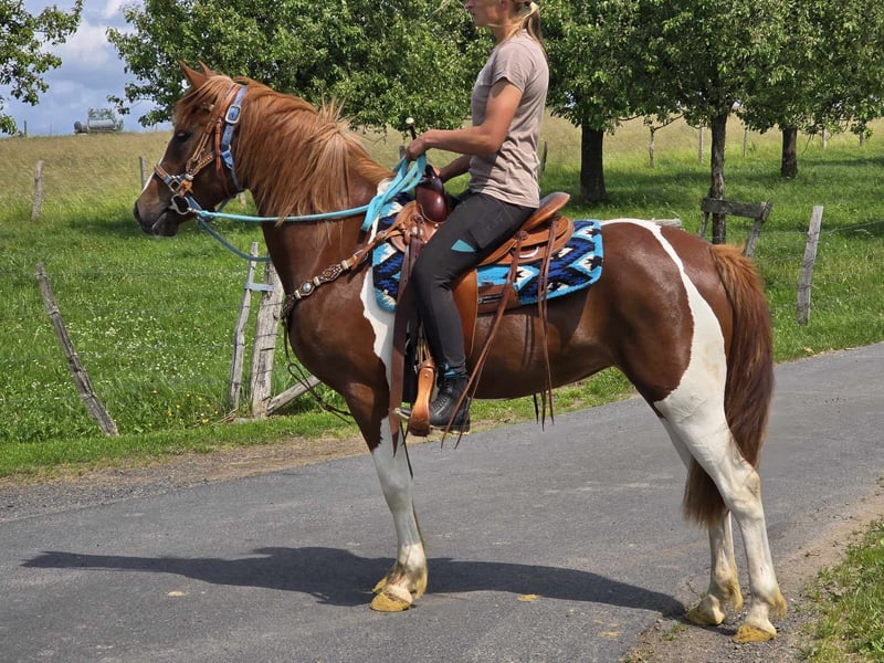 Freizeitstute „Maja “ –Fuchsschecke -Pinto -Mix-Stute für Freizeit und Gelände* *Alter*: 3 Jahre angeritten und schon mal gefahren *Stockmaß*: ca. 1,45 m *Ausstattung*: E-Pass, Microchip und AKU vorhanden *Preis*: .4900 € * geritten und gefahren * Eine schöne Stute die sich ideal für das Gelände- und Wanderreiten eignet. Sie ist ein vielseitiges Freizeitpferd, das sowohl für englisches als auch für westliches Reiten bestens geeignet ist . Sie hat ein tolles, ausgeglichenes Wesen und fühlt sich in der Herde wohl, ist aber auch in der Box gut aufgehoben. ### *Das zeichnet sie aus:* - Offenstall- und Herdenhaltung gewohnt, Boxenhaltung ist ebenfalls kein Problem - Ideal für Freizeit- und Geländereiter - Sehr ausgeglichen und unkompliziert im Umgang *Interesse?* Rufen Sie uns gerne an unter *0171-4001968* (täglich von 8–20 Uhr). *Bitte keine Mails oder WhatsApp, nur Anrufe!* *Zusätzliche Informationen:* - Zubehör und Transport können günstig organisiert werden. - Unser Hofladen bietet eine kleine Auswahl an gebrauchten Westernsätteln. - *Ratenzahlung ist nicht möglich.* *Service für Kunden:* - Jeder Kunde erhält ein vertraglich festgesetztes *Umtauschrecht von drei Monaten.* - Ein Proberitt bei uns ist möglich, damit Sie Ihr Traumpferd kennenlernen können. Für 35 Euro können Sie reiten, sich ihn vorreiten lassen, spazieren gehen oder mehr. Auf Wunsch können Sie auch ein zweites Pferd testen für 25,- . Dieser Betrag wird beim Kauf eines Pferdes am gleichen Tag selbstverständlich verrechnet. *Besonderheiten:* - Bei sofortiger Abholung mit Pferdeanhänger erhalten Sie *einen Nachlass von 100 Euro.* - Wir absolvieren den Verkauf mit einem transparenten Proberitt, um sicherzustellen, dass es das richtige Pferd für Sie ist. *Rechtliches:* - Wir sind alleinige und uneingeschränkte Eigentümer der Bilder; die Bildrechte liegen bei uns. *Fremdverwendung der Bilder ist verboten.* - Bitte beachten Sie, dass es sich um ein lebendes Pferd handelt. Unsere Angaben basieren auf den Eindrücken des Betreuers und stellen keine zugesicherten Eigenschaften dar. - Anzeigen werden sofort gelöscht, sobald die Pferde verkauft sind. *Interesse?* Rufen Sie uns gerne an unter *0171-4001968* (täglich von 8–20 Uhr). *Bitte keine Mails oder WhatsApp, nur Anrufe!