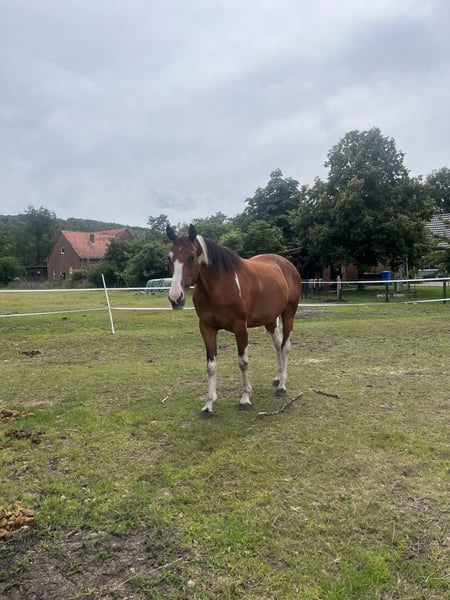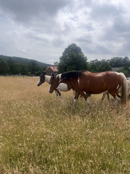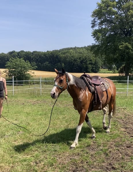 La bonita Amy busca un nuevo hogar. - Yegua - 8 años - Aproximadamente 1,58 m de altura - Documentos del ZSSE con genealogía completa - No montada - Cubierta por un semental Quarter (Jeannes Happy Light) para 2026 Amy no ha realizado mucho en su vida hasta ahora, por lo que es un diamante en bruto. Hasta los 4 años estuvo en una gran pradera con muchos congéneres. Luego fue a una familia, donde frecuentemente acompañaba en paseos a mano y fue longiada. Sin embargo, no hubo tiempo para su entrenamiento completo. Actualmente vive en una manada de yeguas en un paddock abierto, pero también está familiarizada con box y grupos mixtos. En la manada es tranquila y ocupa una posición baja en el rango. Ya ha llevado silla y ha sido longiada con ella. Es bastante sensible y, al principio, algo desconfiada con lo nuevo, pero siempre manejable. Se muestra cautelosa, pero no huye ni se asusta. Necesita una persona de referencia constante; con ella, irá a cualquier lugar. Si buscas un caballo para formarlo tú mismo, ella es la opción ideal. Para consultas o para conocerla, no dudes en contactarnos.