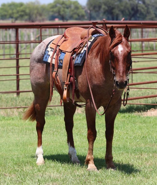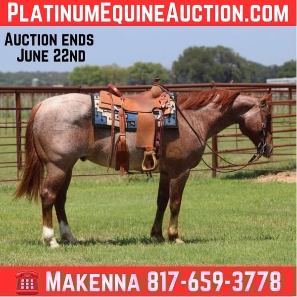 ONLINE AUCTION Place your bids at www.PlatinumEquineAuction.com Starting Bid $3500 Auction ends June 22nd, 2025 Need a new saddle? Check out White Rock Saddles on our website or Facebook! Axel has a heart of gold and is as quiet as any one you could hope to find. Ax always wants to be your best friend, and is sucker for love and attention. He is a grade, red roan, 5 year old gelding standing at 14.3hh tall. Axel is quiet to be around, good with his feet, and a gentleman on the ground. He’s been exposed to almost anything you can imagine including guns, whips, tarps, flags, ropes, or whatever else might look strange to a horse. He wants to ride slow, and relaxed. He picks up both leads nicely and lopes off with ease. Above all Axel really shines, and excels being out on the trails and in the arena. He’s calm, steady, and quiet handling himself in rough country, maneuvering with ease over bridges, bogs, crossing water, etc… Axel has been ridden by all levels of riders, and is forgiving of mistakes made by those who are new, helping to build their confidence. He would really go far in trail versatility classes or would help you to capture the eyes emotions carrying a flag. Whether you’re on the ranch, and in the arena, everyone notices him by his looks, and quiet demeanor. Axel is a seasoned rope horse and would be great for someone to learn on! Axel is located in Lipan Texas. We are more than willing to help with all shipping needs, we ship all over the country as well as Hawaii and Canada. For more information please call Makenna Hartzell 817-659-3778. ONLINE AUCTION Place your bids at www.PlatinumEquineAuction.com Starting Bid $3500 Auction ends June 22nd, 2025 Need a new saddle? Check out White Rock Saddles on our website or Facebook!